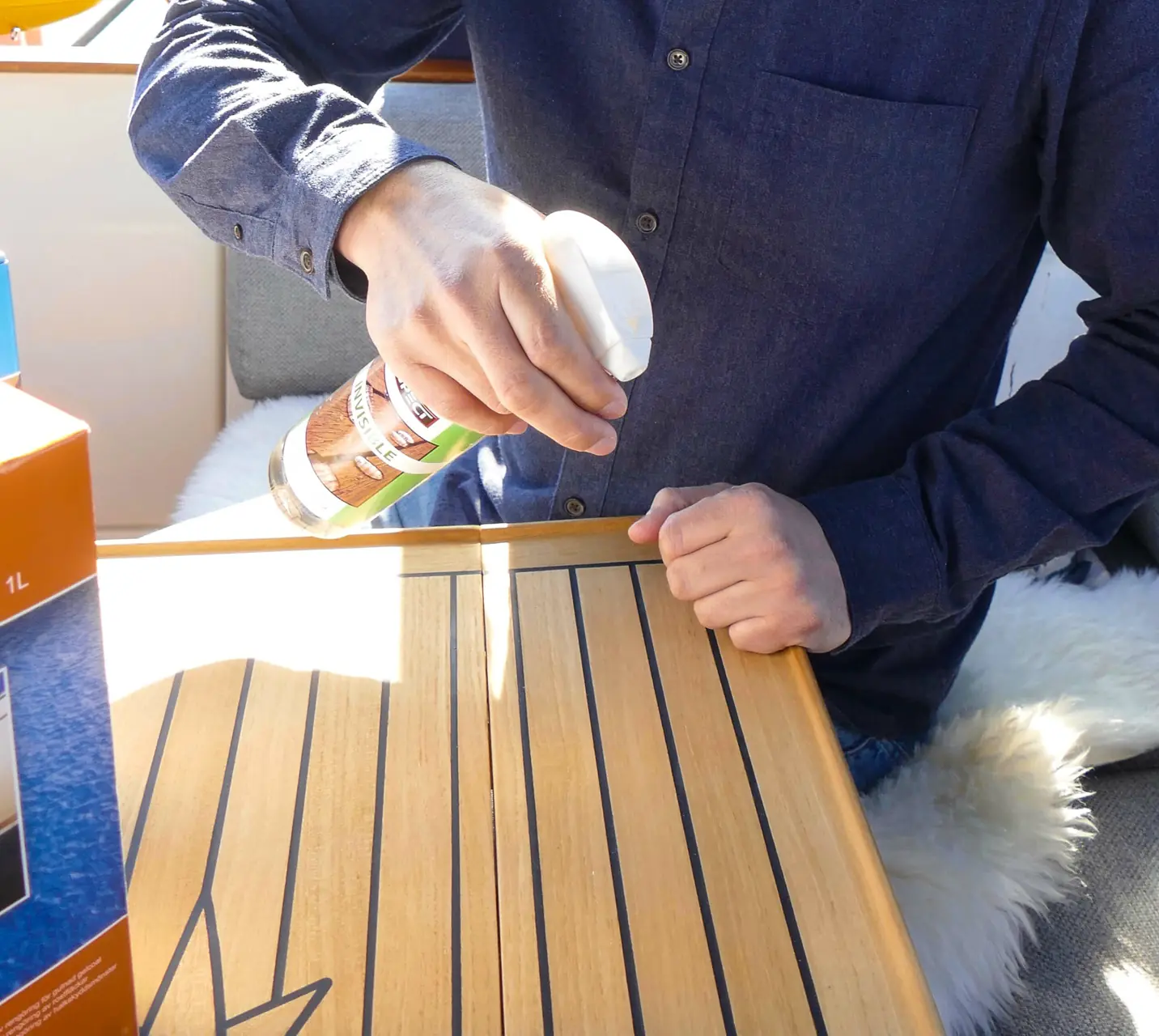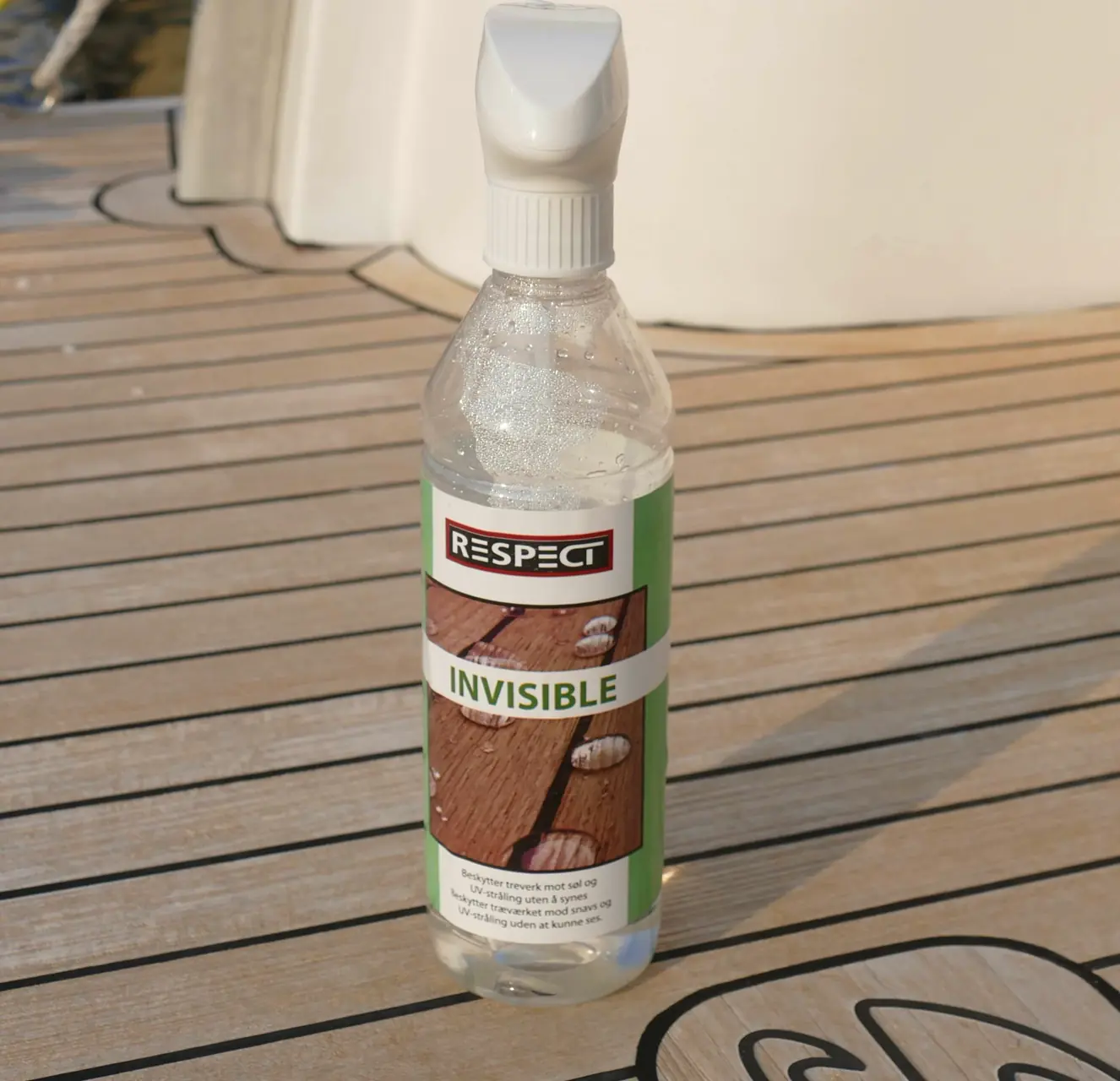 Vi har valgt å beholde dekket fargeløst. Det vil si at vi ikke ønsker å sette inn dekket/plattformen med en fargetone. Og hva skulle vi velge da? Tidligere har vi ikke brukt noen verdens ting. Kun vasket dekket fra tid til annet med såpevann. I år valgte vi å bruke Respekt Invisible. Den finnes på flaske hvor vi sprayer produktet på ren, tørr flate. Vi brukte dette på badeplattformen og på et nytt salongbord om bord. Vi ga begge fire omganger med Invisible. En helt klar veske som legger seg som en beskyttende hinne over teaken. Det gjør at du ikke skal være redd for å søle rødvin eller annen veske på teaken. Den trenger ikke ned i trevirket - det er bare å tørke av med en klut. Det eneste Invisible ikke takler er fett. Ellers er all veske bare til å tørke vekk.