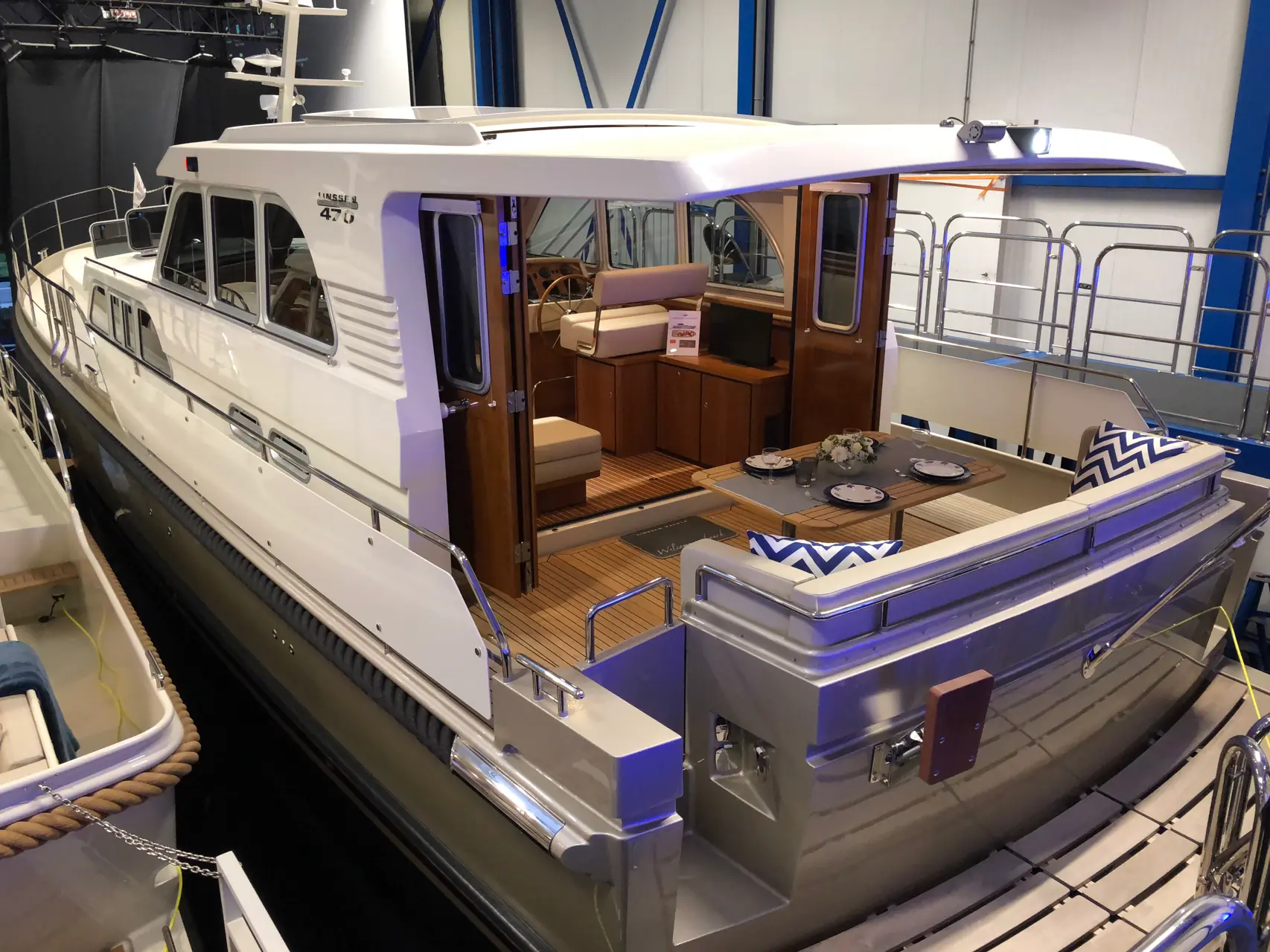 Jeg blir invitert rundt på verkstedet og går ombord i flaggskipet, en Linnsen Grand Sturdy på femti fot. Et hav av plass for de som skal overta denne. 30 tonn, fordelt på 16.45 meters lengde og 4.88 bred. Denne stikker 1,29 meter dypt. Her finnes all den luksus du kan ønske deg, aggregat, et hav av kjøle- og fryseskap/skuffer, full navigasjonsutrustning, et par TVer, ismaskin og tykke madrasser du knapt kjenner smaken av erter under. Motorrommet er romslig med 2 x Volvo Penta D3, hver på 150 hk. Og selvsagt baug og hekkstrøstere, klimakontroll og liknende.