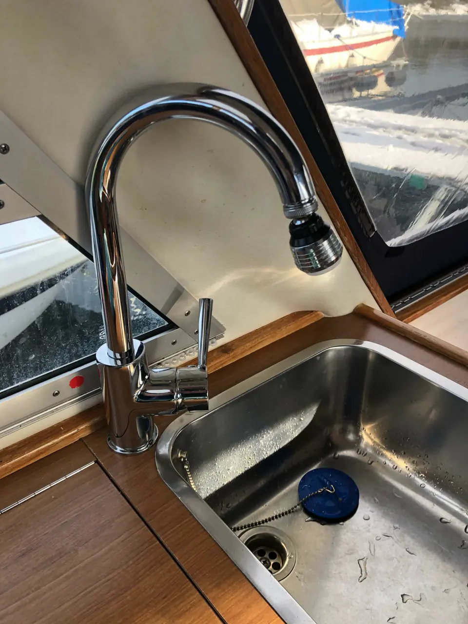 Oppgradert vannkran: Vi valgte et blandebatteri fra Biltema når vi først skulle bytte. Det gamle som stod der siden båten var ny i 2003 og hadde fått en frostskade. Pris ca. 600.- kroner.