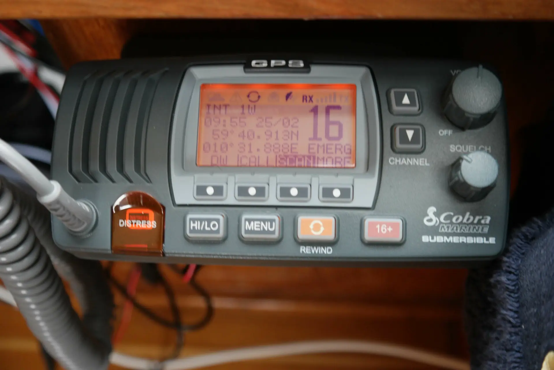 Vi valgte å skifte ut en gammel VHF mot en ny, med den røde distress-knappen og innebygget GPS. For oss er VHF-radioen ensbetydende med god kommunikasjon mellom Kystradioen og andre fartøy. Vi har testet denne i flere omganger mot Kystradio Sør og fått gode rapporter. Denne har også en repeterende talefunksjon fra de siste 30 minuttene av siste samtale. Pris for Cobra MRF77 er ca. kr. 2 999.-.