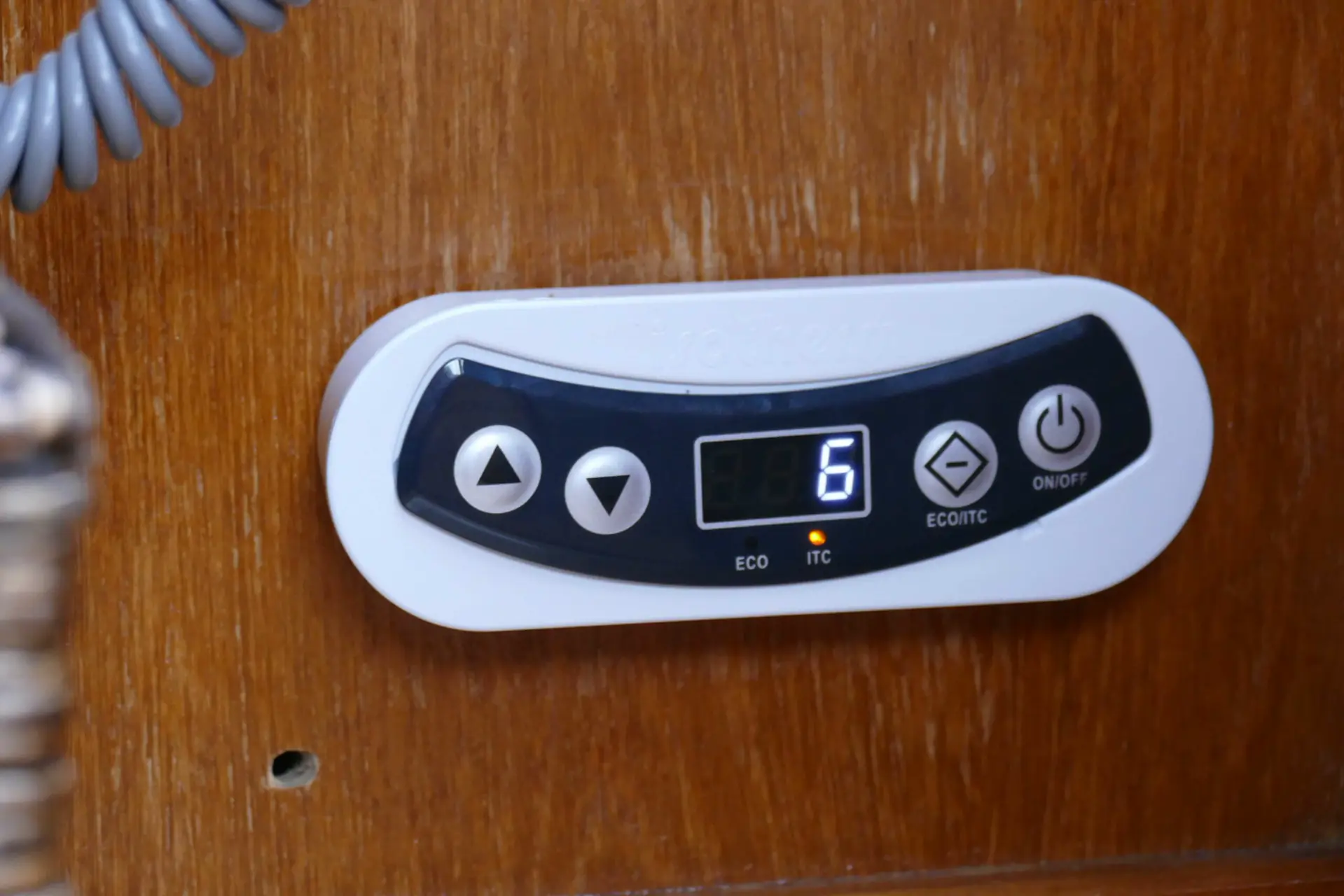 Vi valgte å skifte ut det gamle kjøleskapet mot et nytt som brukte mindre med strøm. Isoterm Cruise Elegance Line har et stilfull design. Hyllene kan justeres i høyde. Stillegående kjøleskap med en eksternt innstillingspanel slik at vi slipper å krype inn i skapet for å justere kjøletemperaturen. Pris for vårt 49 liter er ca. 8.500 kroner.