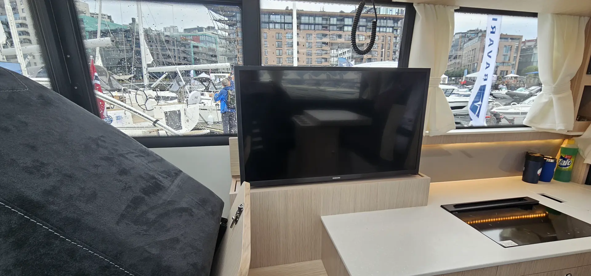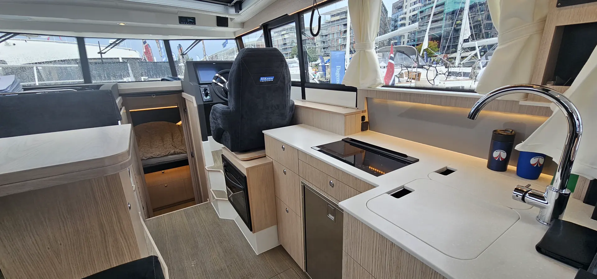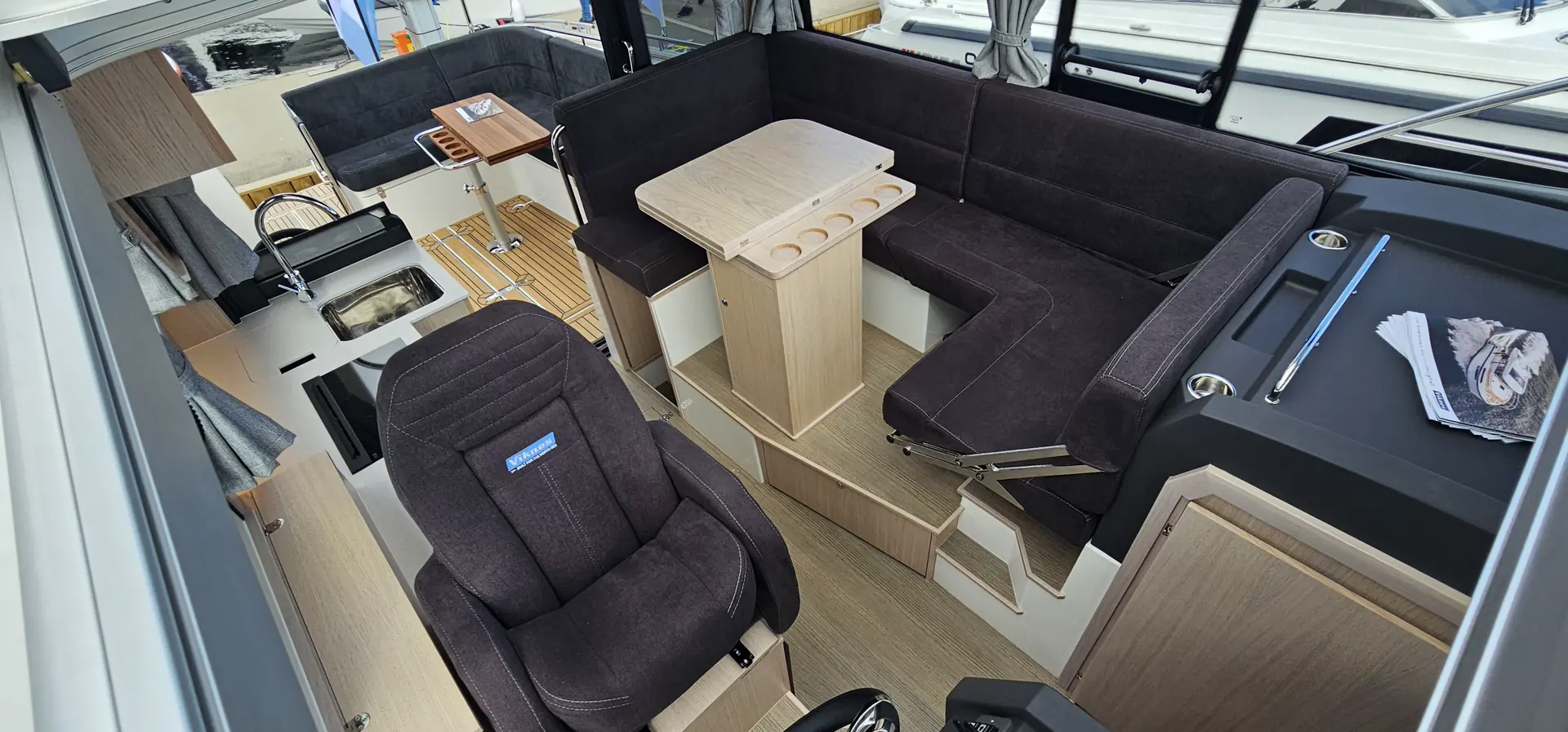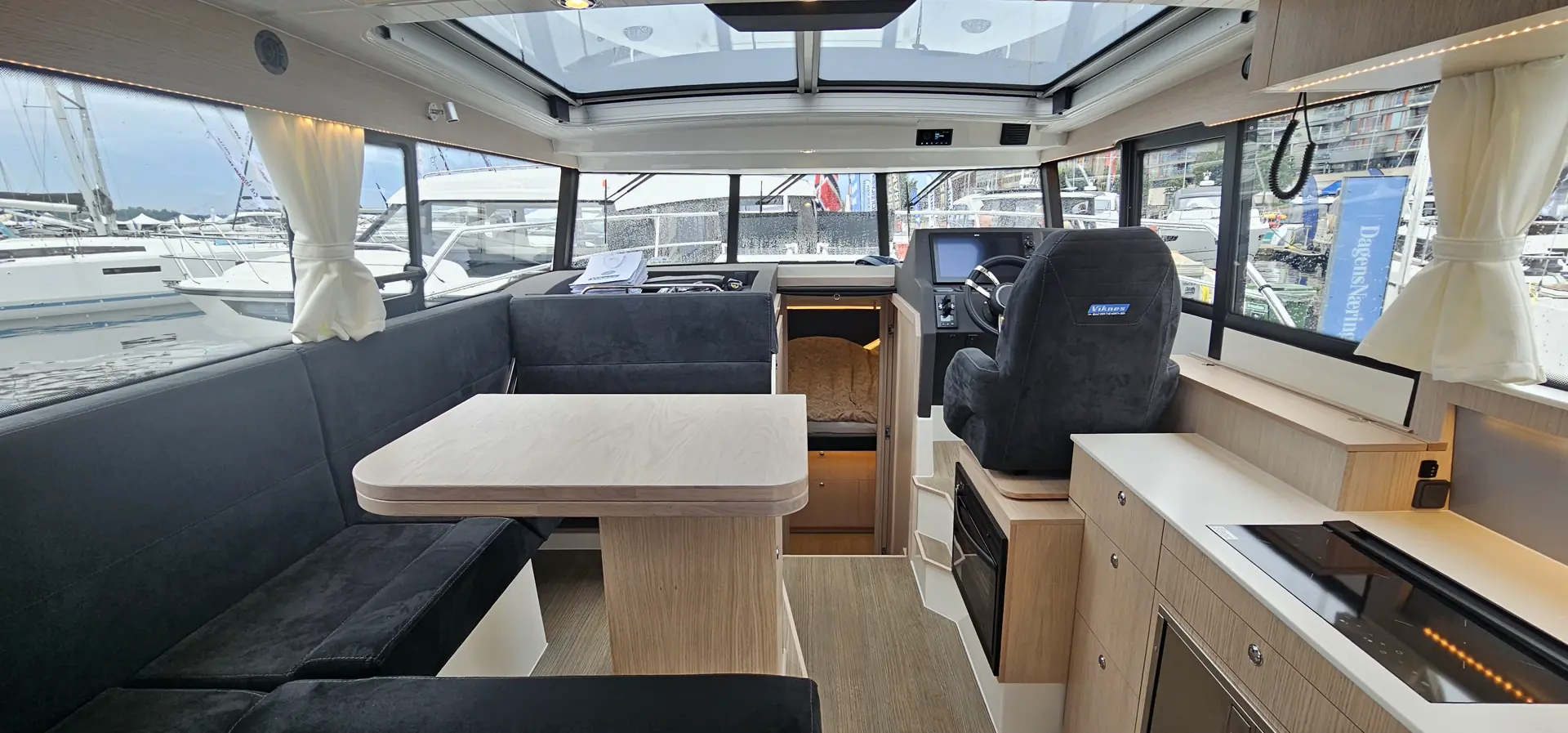 Fra den aktre styreposisjonen og inn til pantry og salong kan du senke glassruten på styrbord side. Når glassdørene inn til salong åpnes får du en helt åpen båt og en god flyt mellom inne og ute.