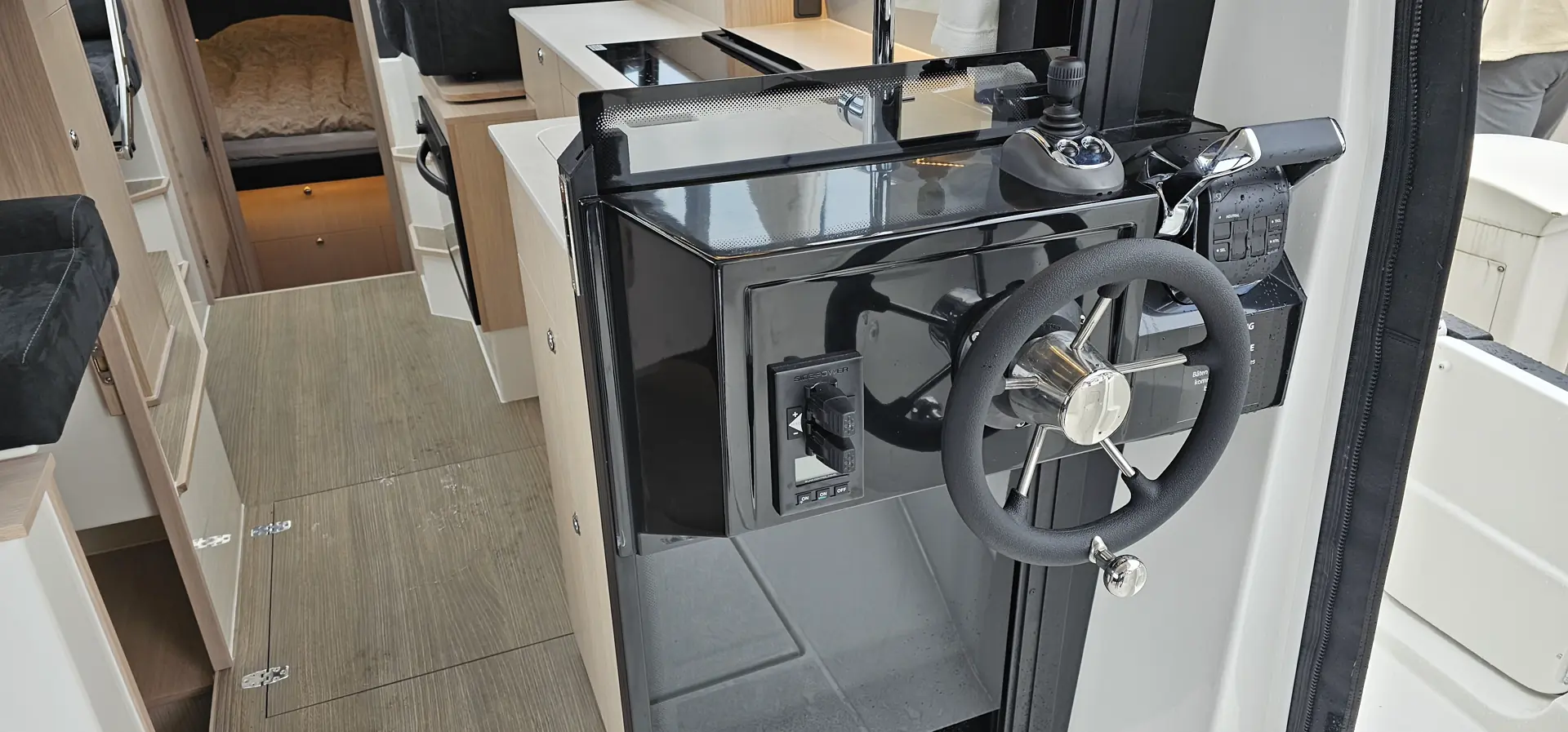 Fra styreposisjon er alt innen rekkevidde, solid og behagelig sete, skyvedør ut til dollbord, gjør det enkelt å betjene båten alene. I dollbordet på styrbordside er det nedsenket fenderlagring, som er meget praktisk.