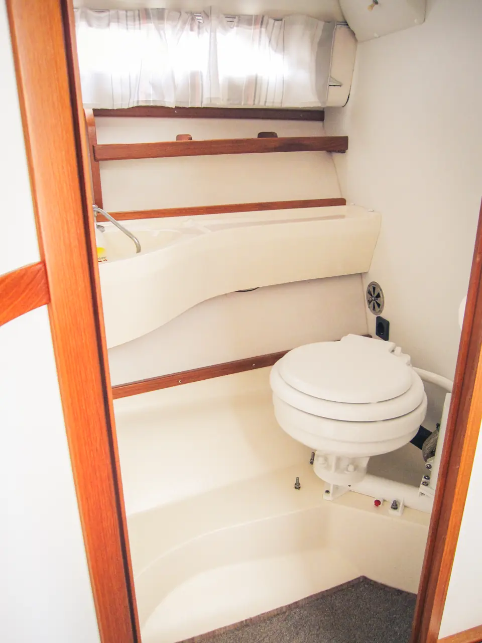 På styrbord side «under» instrumentpanelet finnes et toalett, men det er så lite at en voksen person har problemer med å kle av seg med døren På styrbord side «under» instrumentpanelet finnes et toalett, men det er så lite at en voksen person har problemer med å kle av seg med døren lukket. Belysningen og ventilasjonen er god. Stuveplassen, en åpen hylle med en lav kant, pynter opp, men gir ikke plass til mange ting som skal oppbevares. Bokomforten ombord er nok begrenset, men forut er det liggeplass til tre voksne personer – eller to voksne og to mindreårige barn.