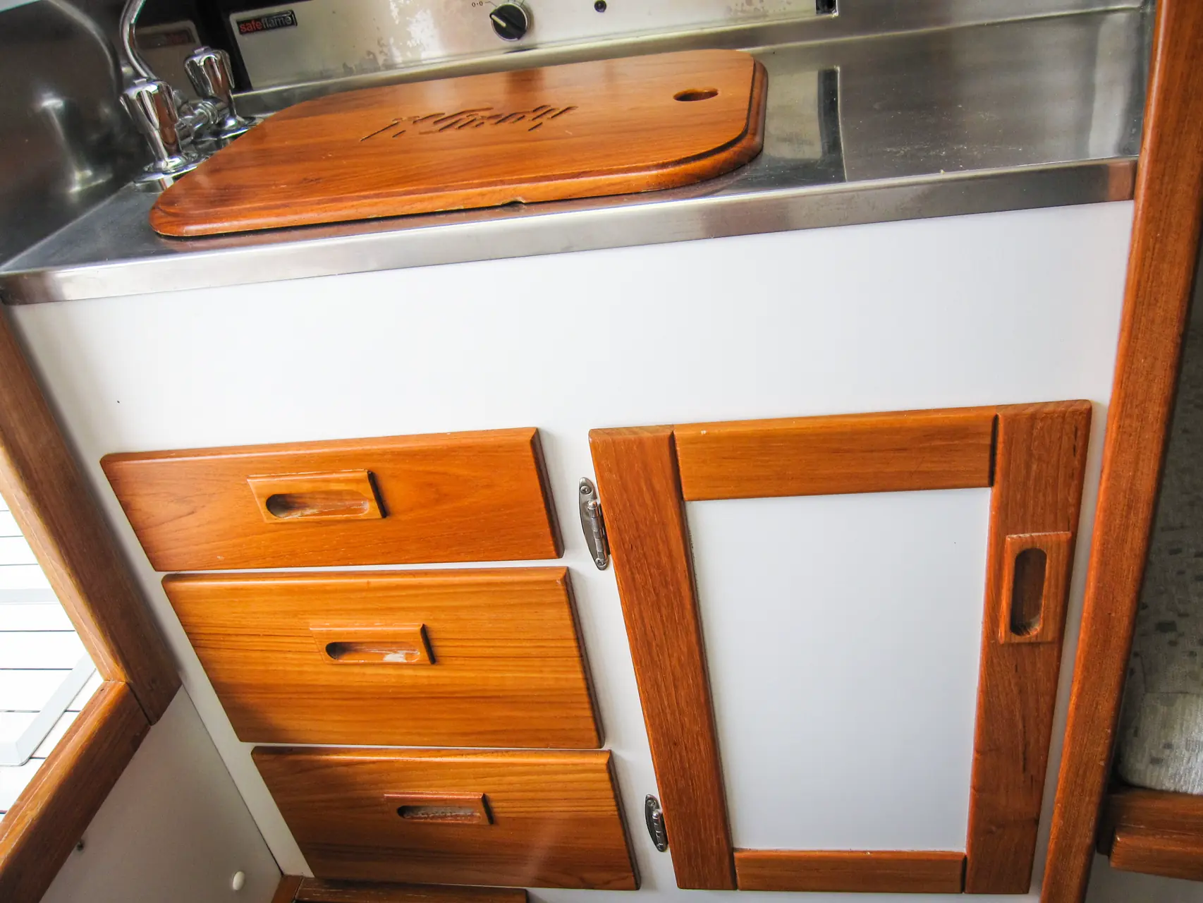 Rett nedenfor trappen ned til kabinen finner man et pantry med kokeplate, vaskekum og vask. Stuveplassen er god, blant annet fordi kjøleboksen med supercoolaggregat er plassert under dørken i cockpiten ved nedgangen til cabinen.