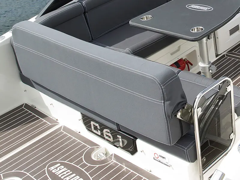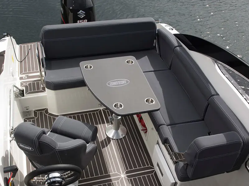 Båten har en gedigen cockpit med en koselig sitteplass med bord og sofa som kan transformeres med enkle grep til en solseng. Båten har også soveplass til 2 voksne i forkabin.