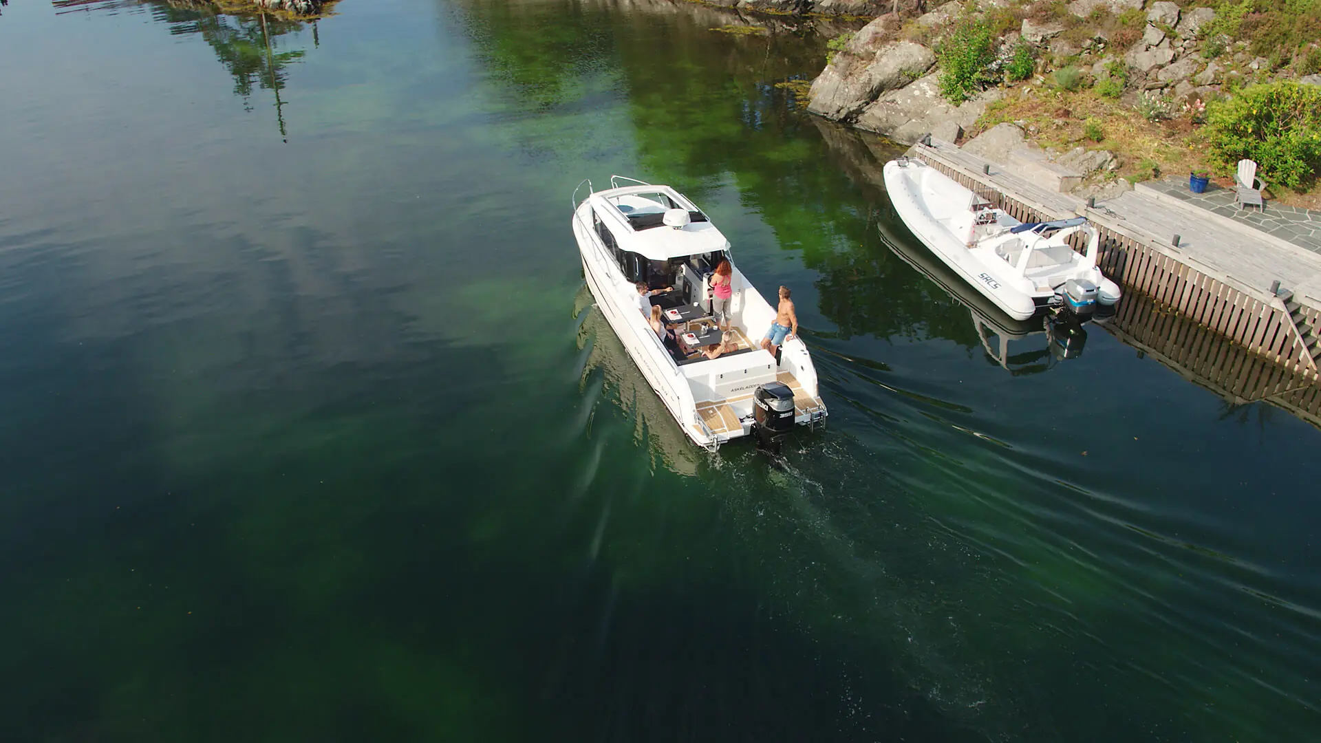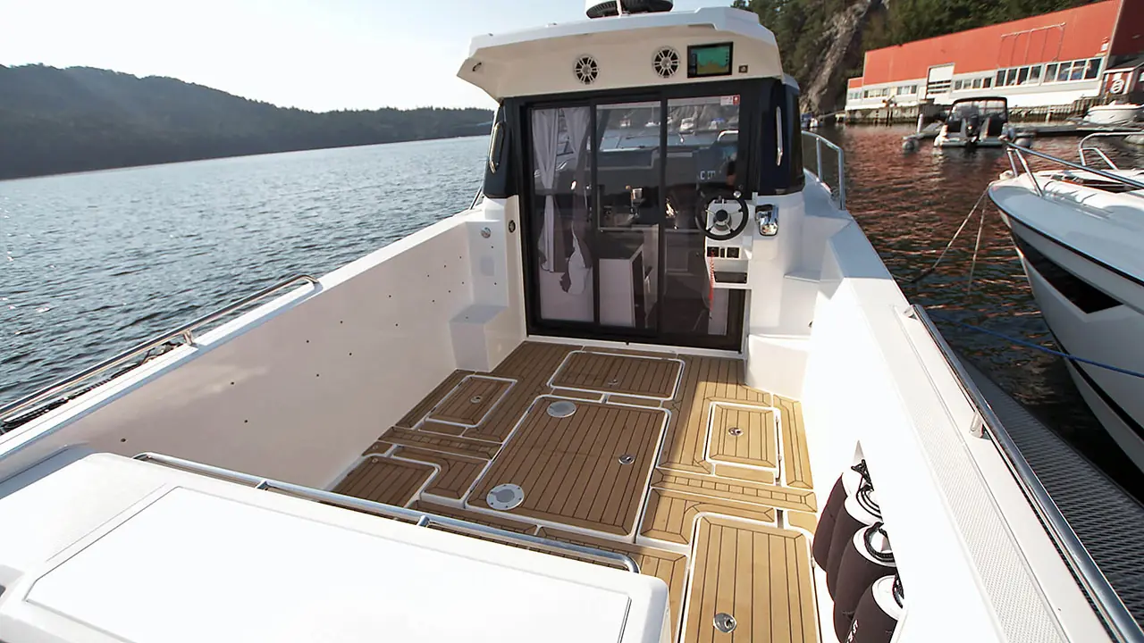 Aktenfor det lukkede akterdekket er det et stort plattformområde med god passasje fra styrbord til babord side. Alt er forberedt for montering av spylepumper, sirkulasjonspumper, garn-, teine- og linehalere, slik at denne båten kan bli en rendyrket arbeids- og fiskemaskin. Ved hjelp av modulsystemet kan du i løpet av minutter enkelt rekonfigurere fiskemaskinen din til en komfortabel turbåt med et sosialt akterdekk for hele familien.