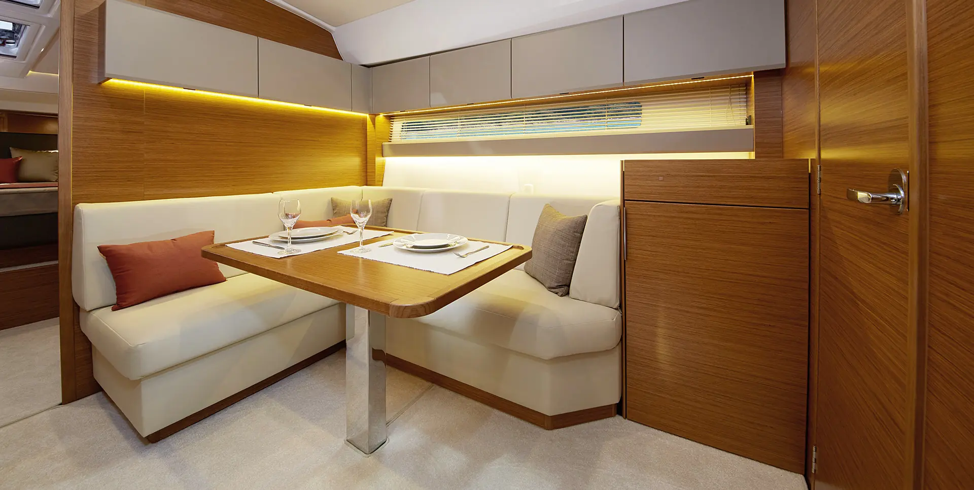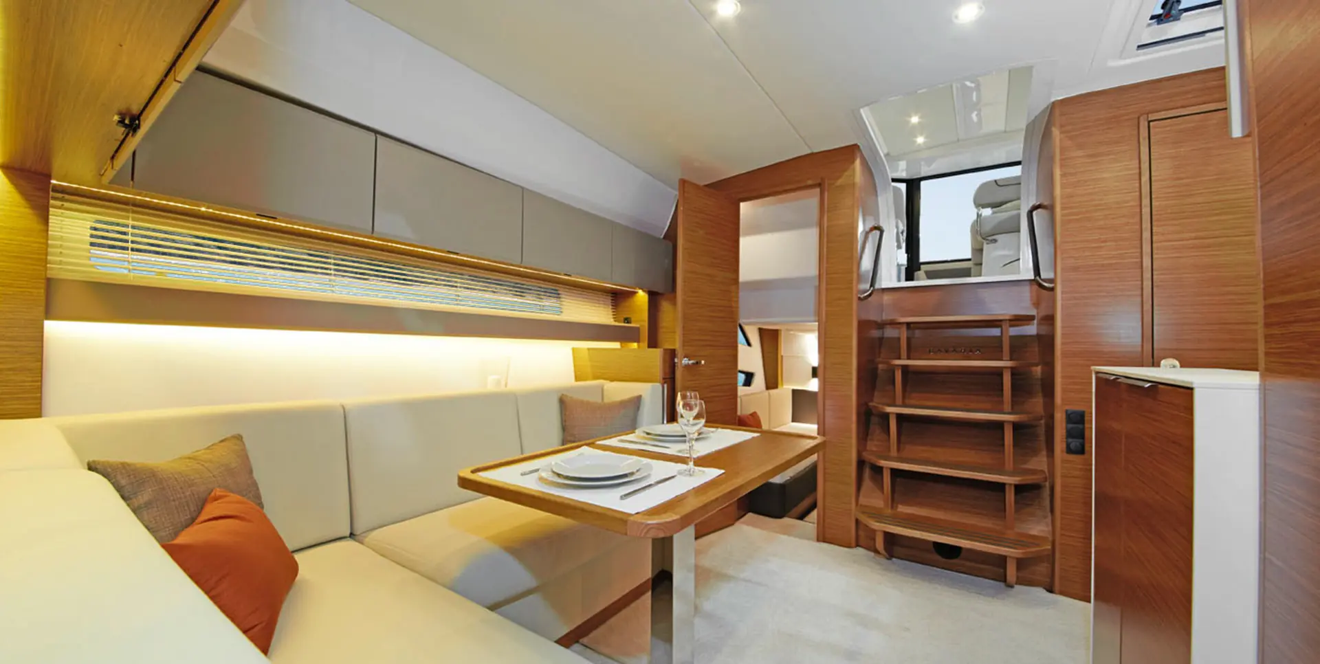 Salongen i cockpit har en stor u-sofa med et bord som kan foldes ut til dobbel størrelse. Her dekker du fint til middag for 8 personer! Akter finnes en nydelig solseng som raskt blir favorittstedet å være for hele familien. Under solsengen er det plass til et enormt stuverom eller jollegarasje som du enkelt kan gå inn i. Supert på ferieturen hvis du ønsker å ha med sykler, grill, stoler, vannleker osv. Med forlenget og hydraulisk senkbar badeplattform er det å ha med jolle eller vannscooter på tur også en lek. Veldig enkel håndtering og en herlig plass å bade for store og små.