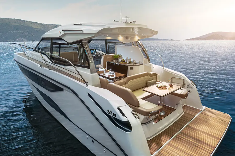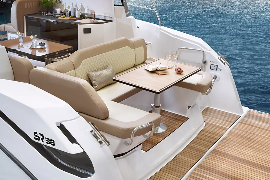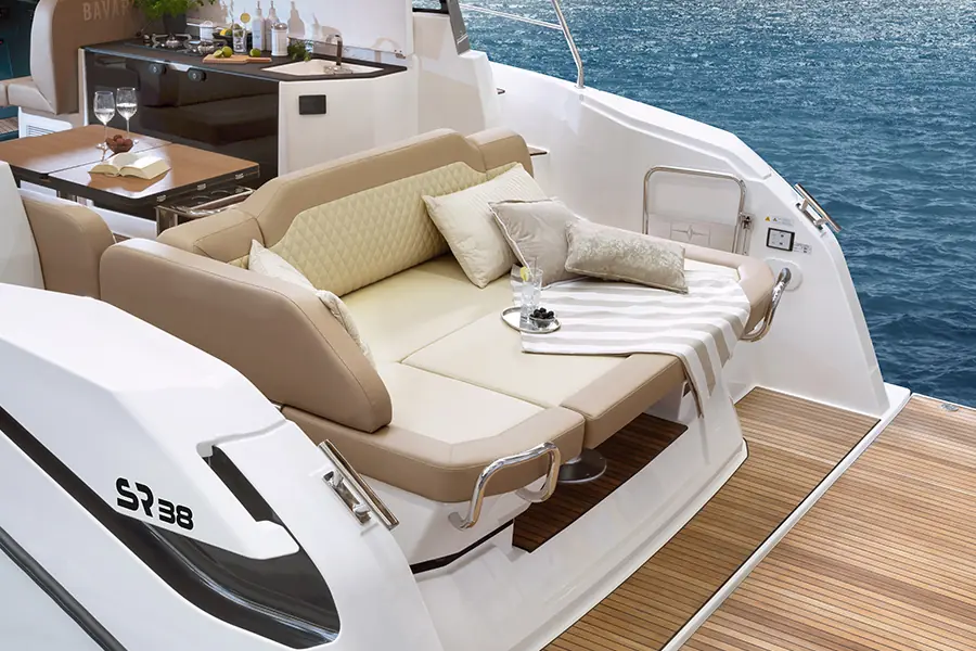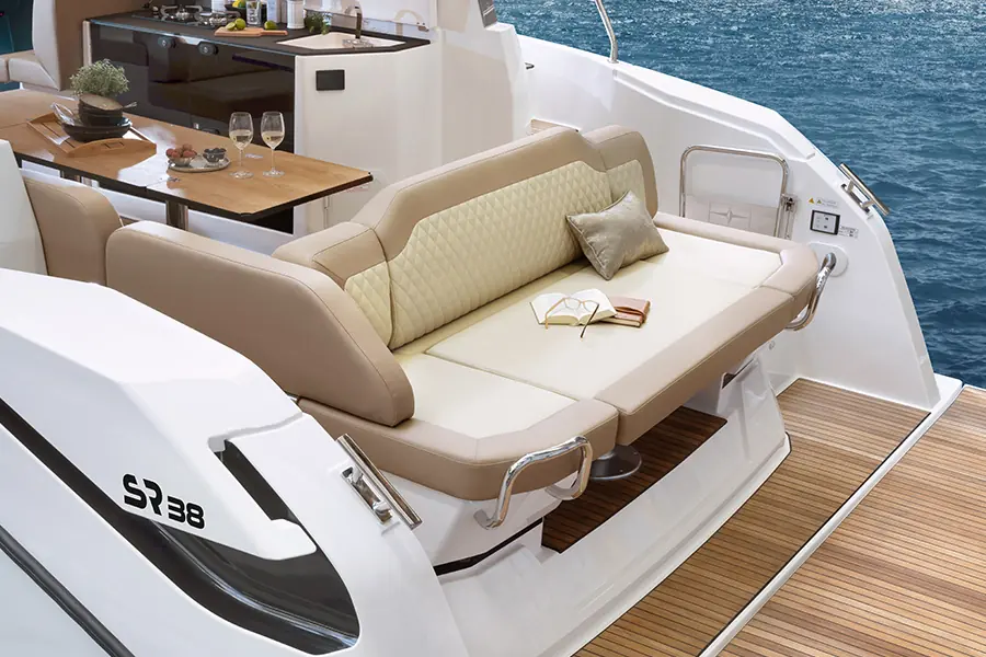En fleksibel seteløsning gjør at du kan tilpasse salongen etter behov og det er for eksempel mulig å dekke til middag for 8 personer rundt samme bord. I tillegg kan man velge å ha en sittegruppe helt akter, eller kombinere med en deilig solseng. Under benkene er det store stuverom til det du måtte ønske å ha med deg på tur. Førerplassen er glimrende med nyutviklet dashbord og plass til to stk 12" kartplottere om ønskelig. Det er flere sitteplasser i fartsretningen og solmadrassen høyt og fritt på babord side er en favoritt for store og små. Selvsagt har SR38 også en herlig forlenget badeplattform i full bredde, med masse plass så nære vannet du kommer.