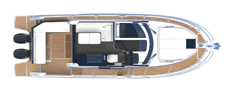 Båtens mange innovative løsninger sikrer et høyt nivå av komfort: en aktersolbenk, en sidebadeplattform som skaper en terrasse med havutsikt, og en aktercockpit som flyter naturlig inn i styrehuset.