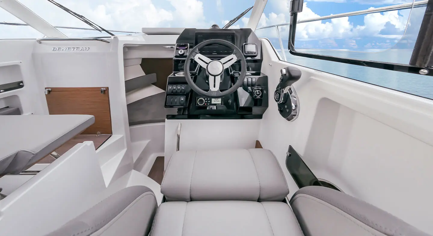 Fra den sofistikerte polstringen til den svingbare kapteinsstolen og de justerbare andrepilotens seter, som kan vippes for å vende mot enten salongen eller ut mot havet. Antares 8 er smart designet og ideelt for familiecruise. De store tonede vinduene gir fantastisk havutsikt samtidig som det holder interiøret godt opplyst og ventilert. Salongen er både elegant og praktisk, og innredningen på Antares 8 inkluderer et bysseområde med kjøleskap og valg av gass- eller elektrisk koketopp.Antares 8 kan også utstyres med klimaanlegg.