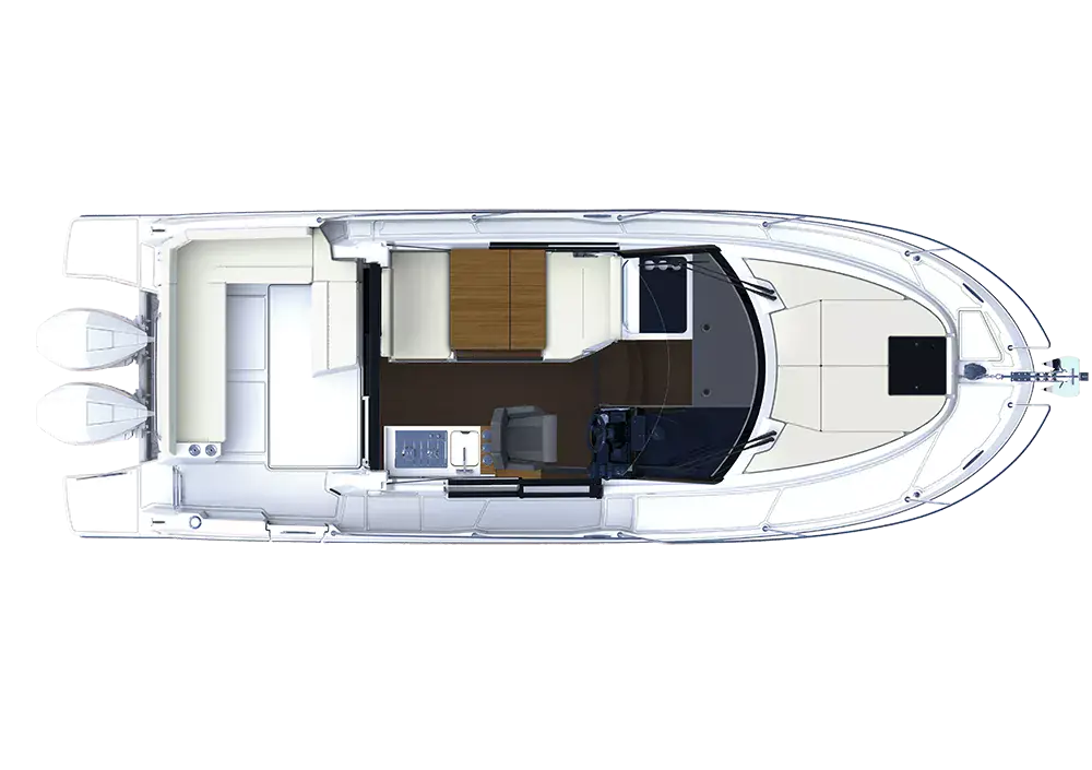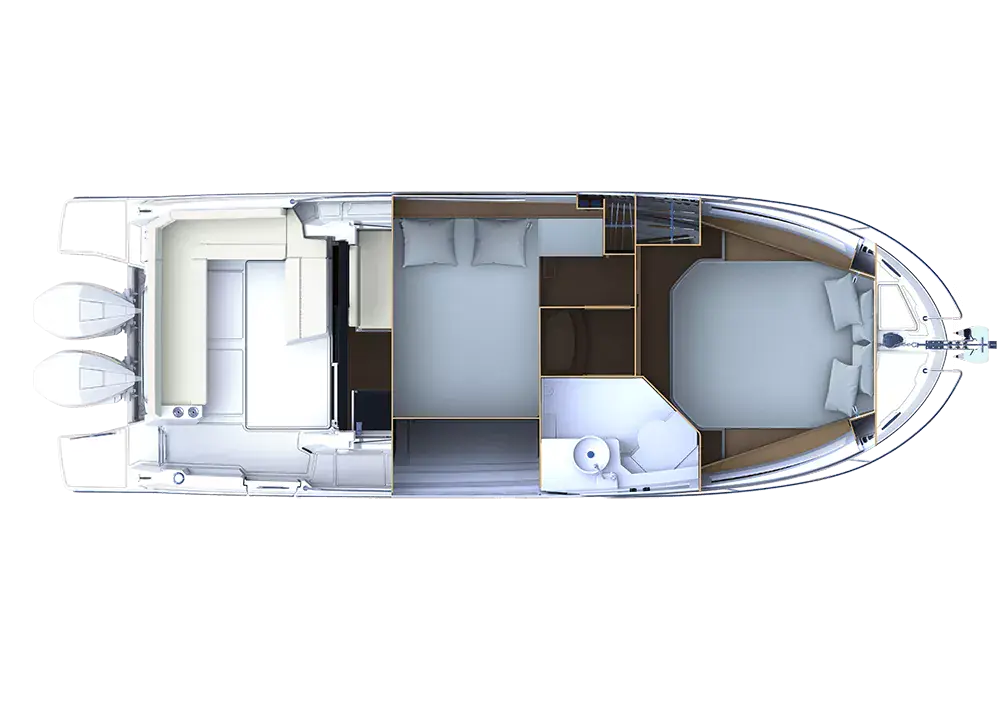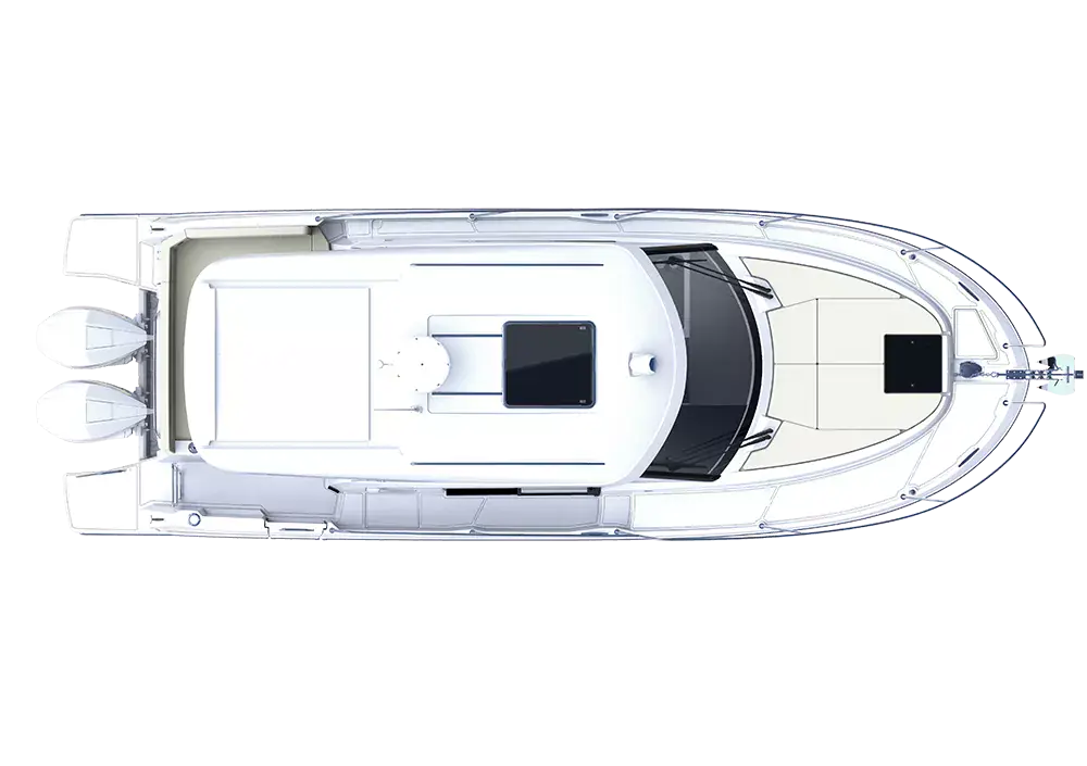 Akterdekket har stor sittegruppe som kan gjøres om til solseng. Det er godt med stuerom og skap både inne og ute. Skroget er helt nyutviklet og har en svært spiss og dyp baug seksjon. Dette gir veldig myk gange i motsjø. Skrogsidene er høye og bidrar til svært mye innvendig volum. Skrogvinduene bidrar også til en lys og trivelig atmosfære innendørs. I det hele tatt en komfortabel bobåt med moderne design og løsninger.