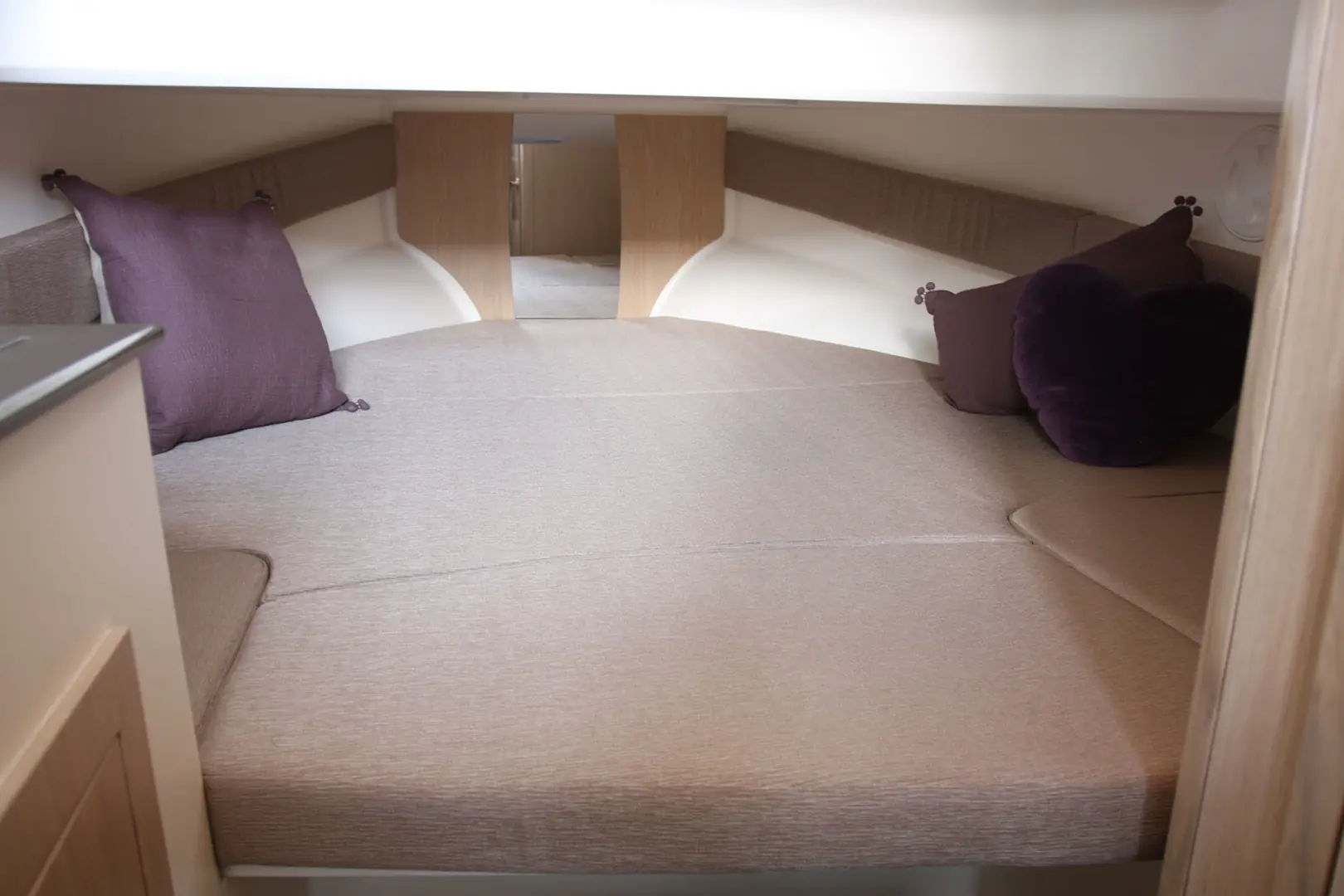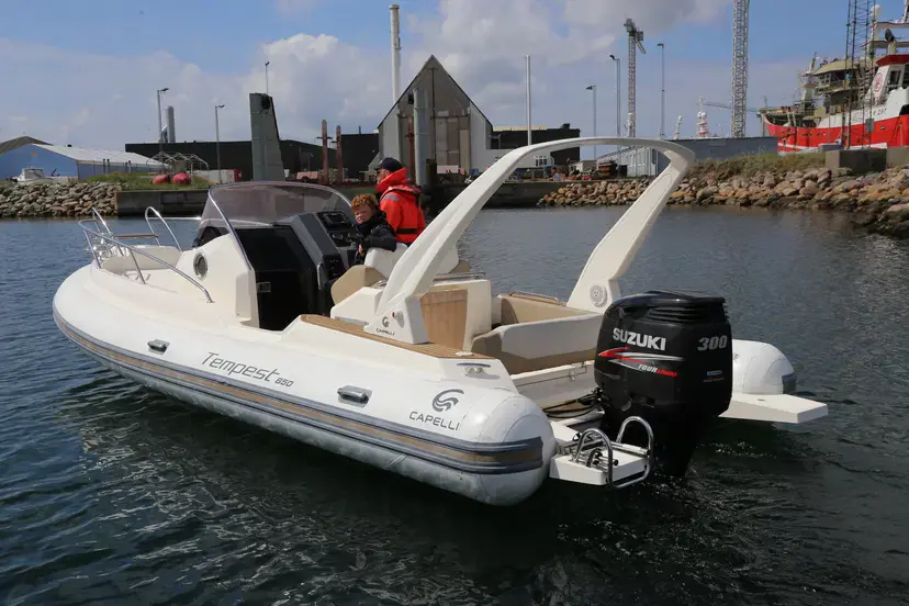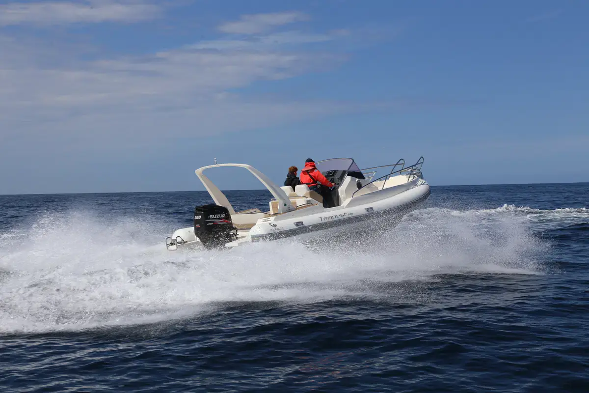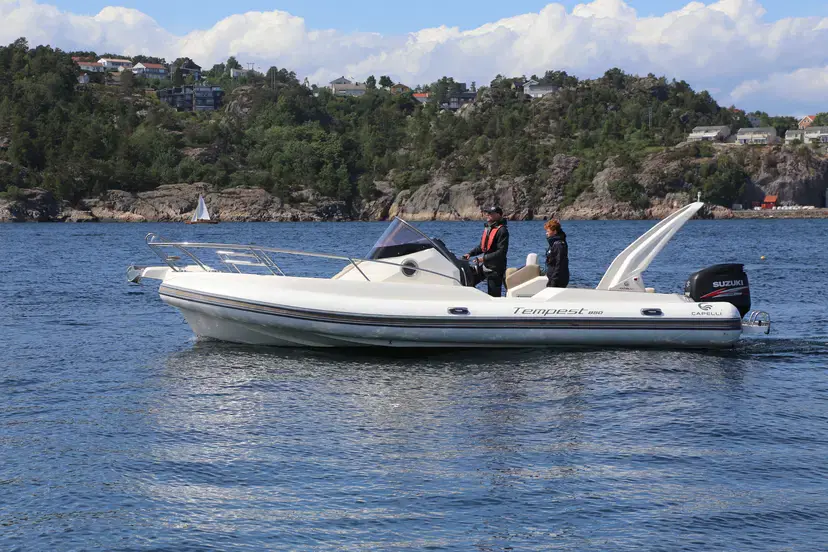 Tempest 850 WA er en imponerende RIB-båt kjent for sin behagelige kjøring og overlegne komfort. Den har et responsivt skrog som gir suverene sjøegenskaper. Båten tilbyr et romslig hekkområde med sammenleggbart teakbord, ideelt for sosiale sammenkomster, samt en ergonomisk vippepute for førerog en kabin som kan huse 2-3 personer for overnatting. Soldekket er sikret med en rustfri håndløper. Kabinen har en solid spiseplass og et elegant designet toalett med dusj.