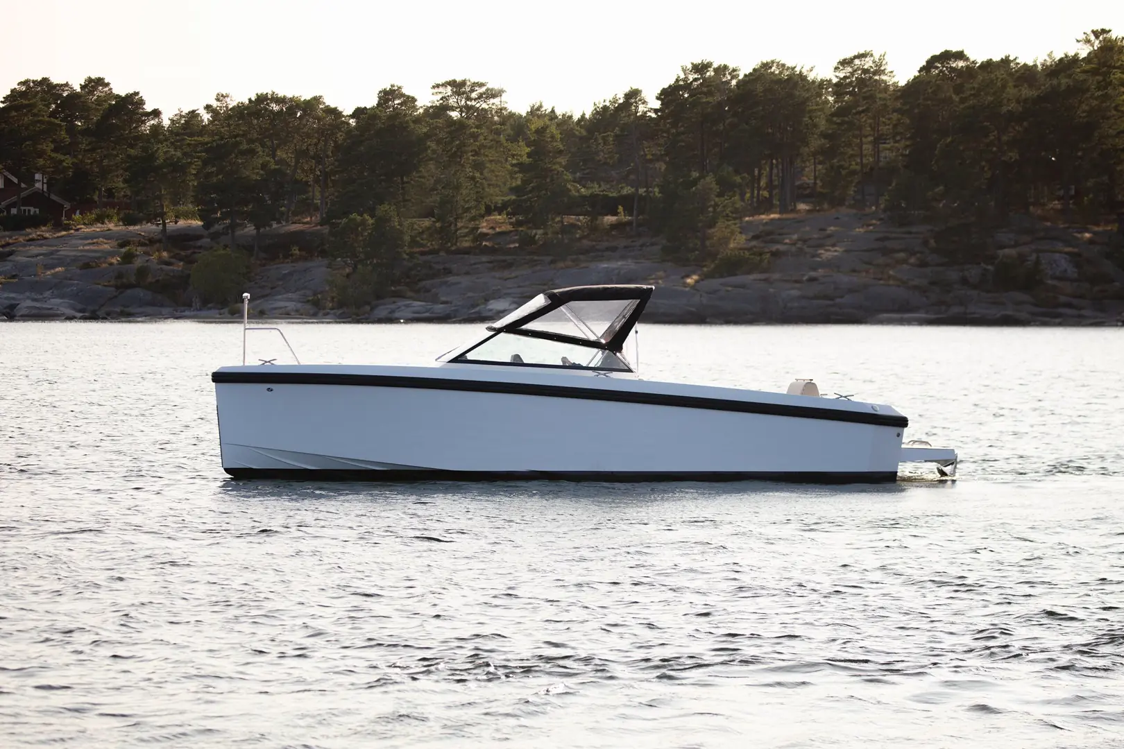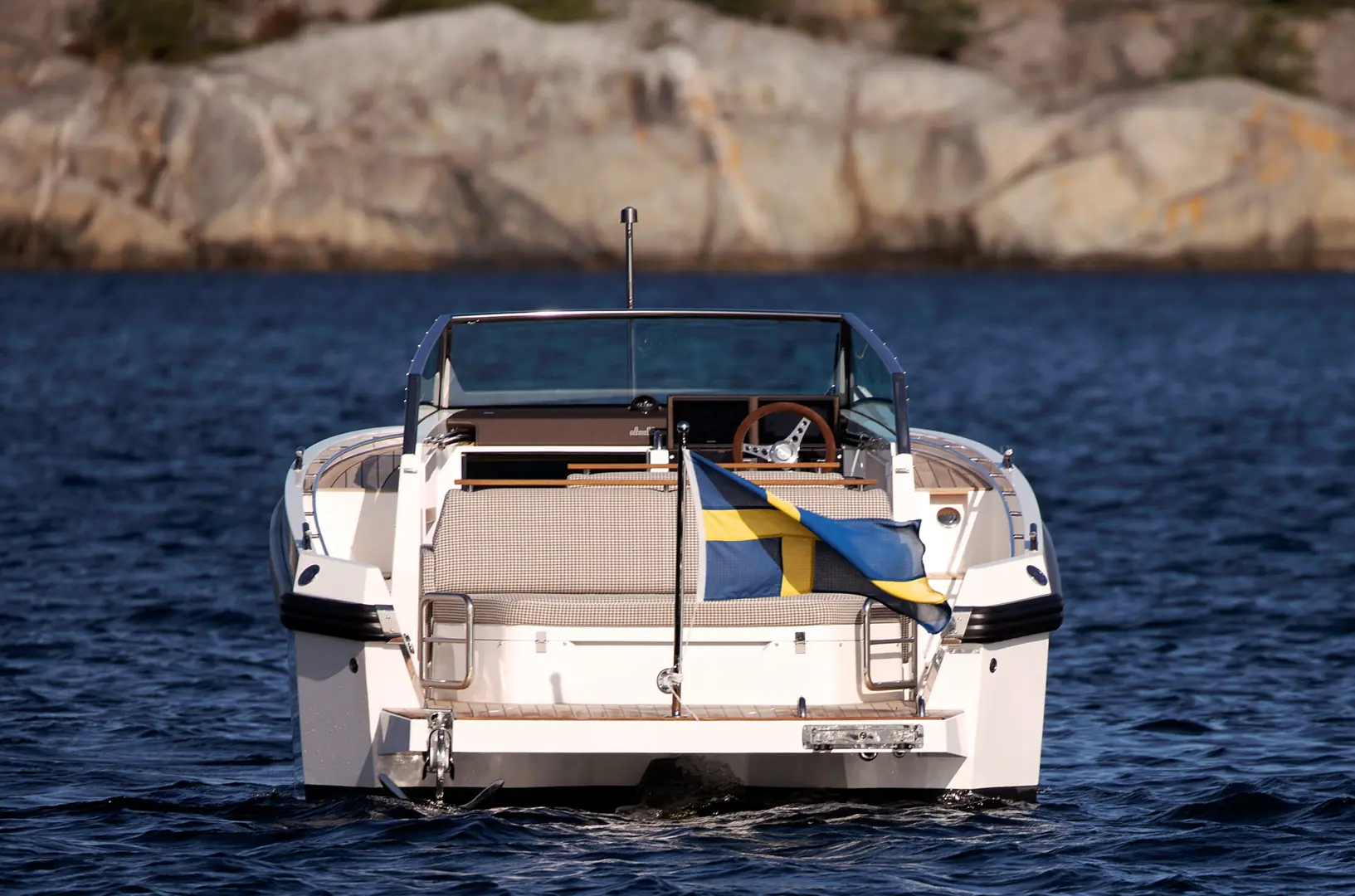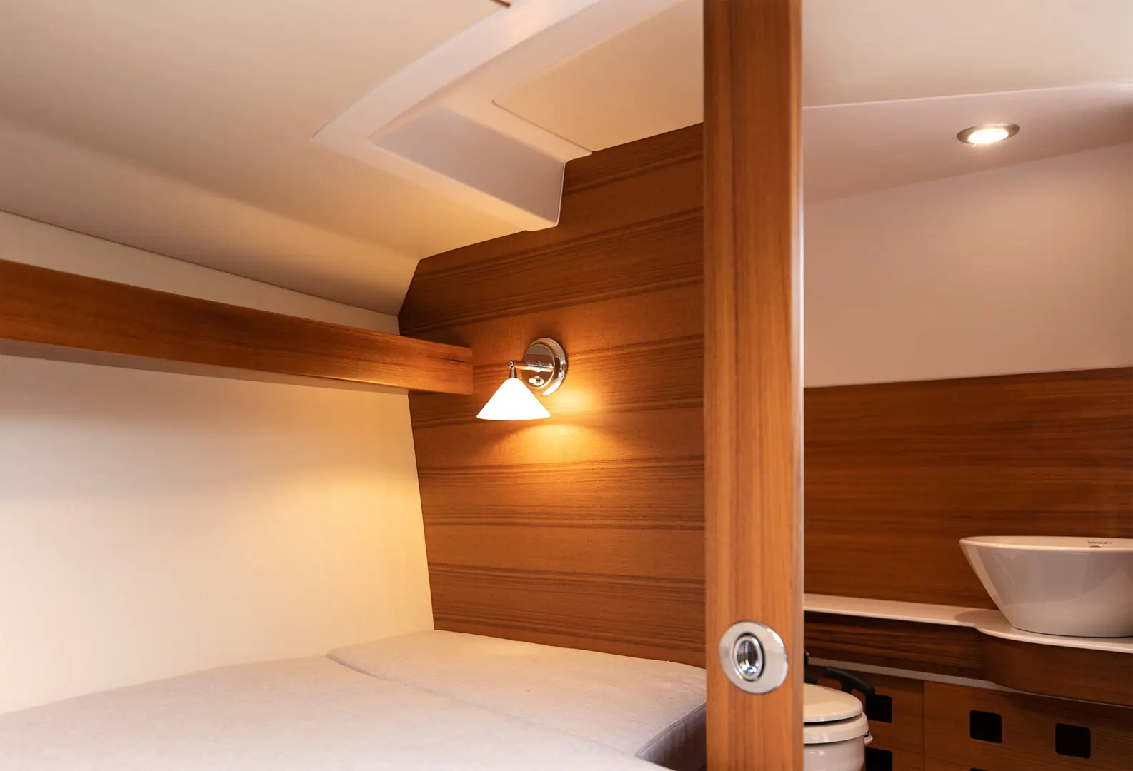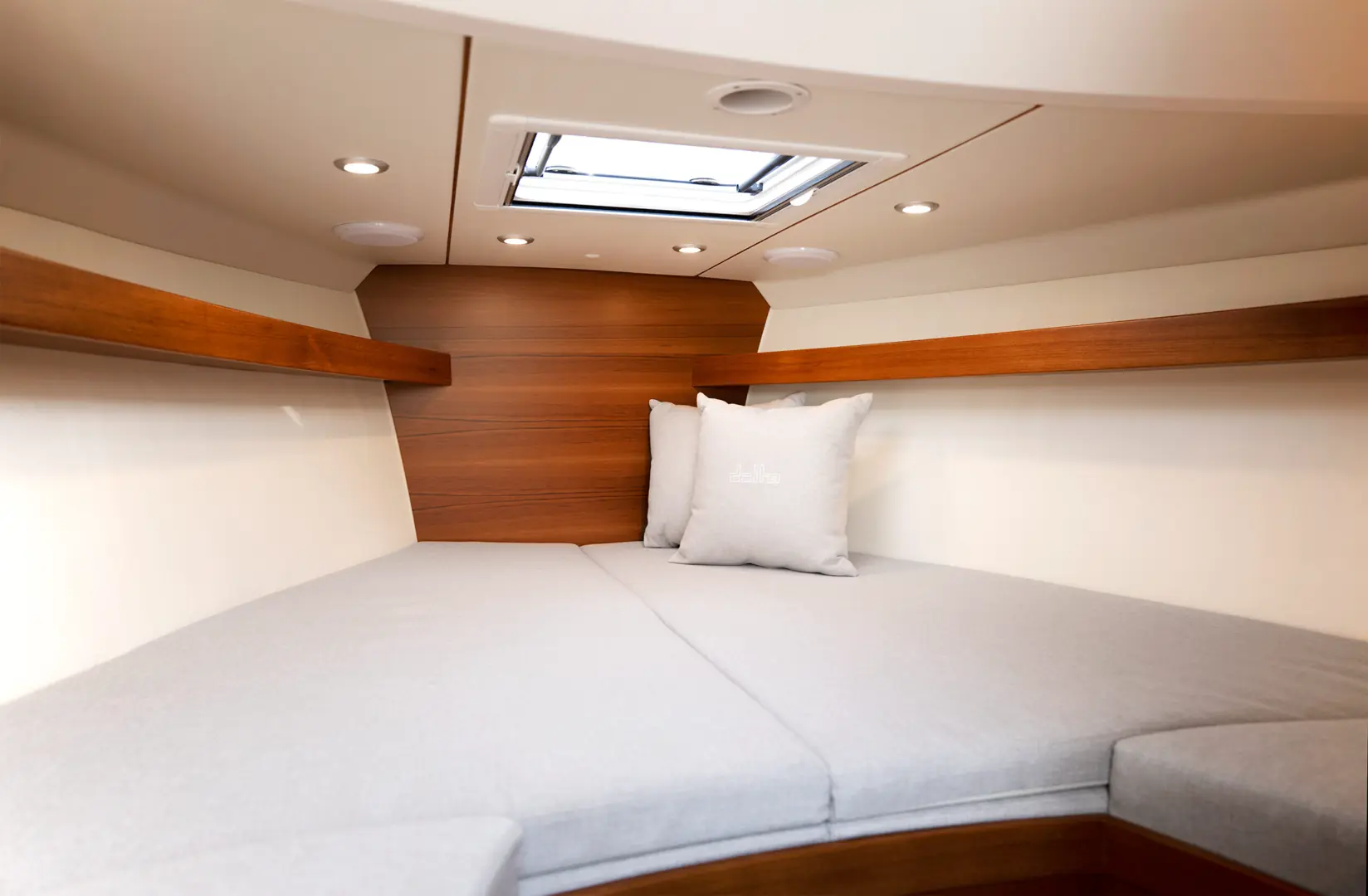 Mannerfelt-skroget med sin doble steppede konstruksjon gir enestående effektivitet og stabilitet, selv i hastigheter over 50 knop. Under dekk finnes en fremre lugar med komfortabel overnatting for to personer, samt et separat toalett/bad.