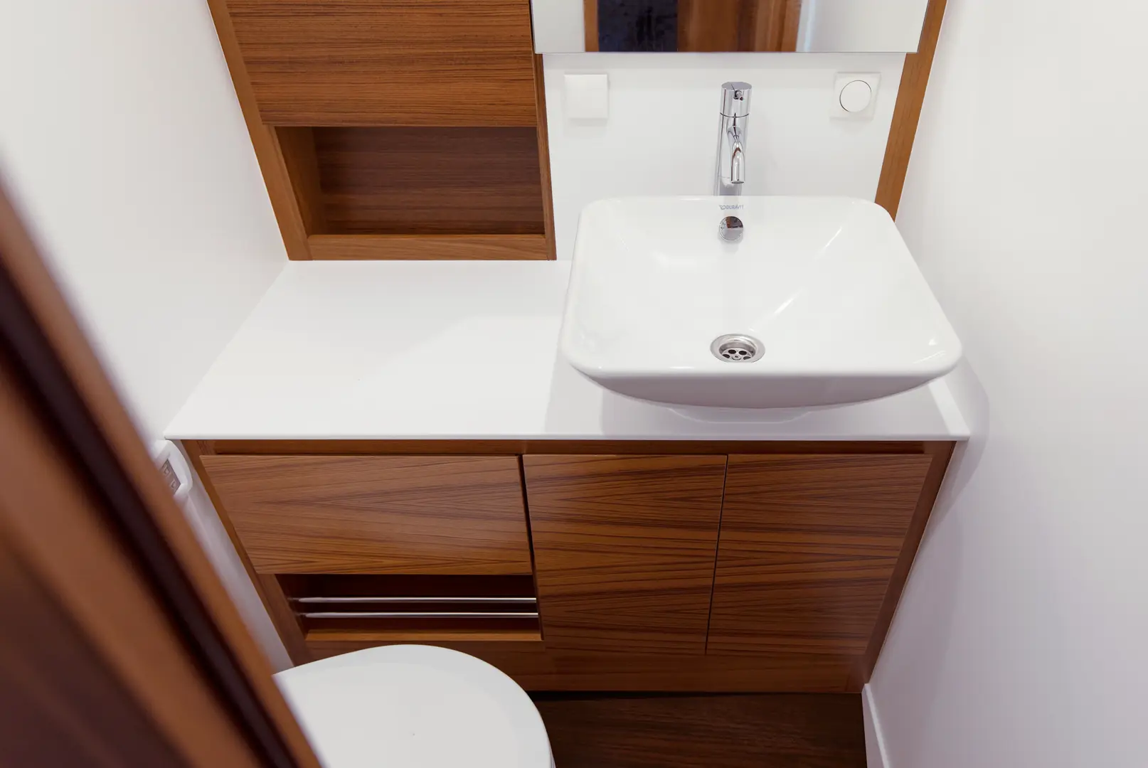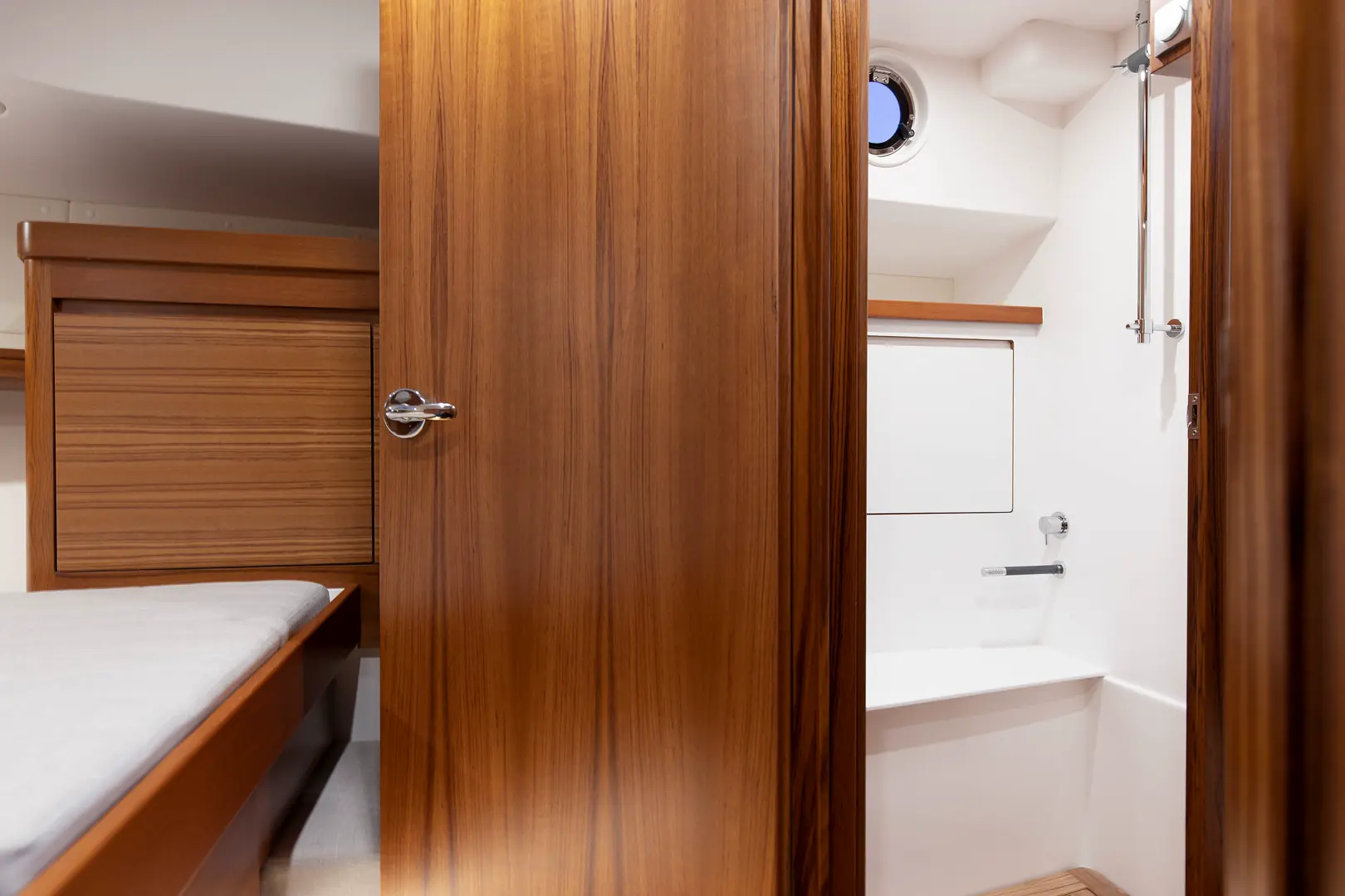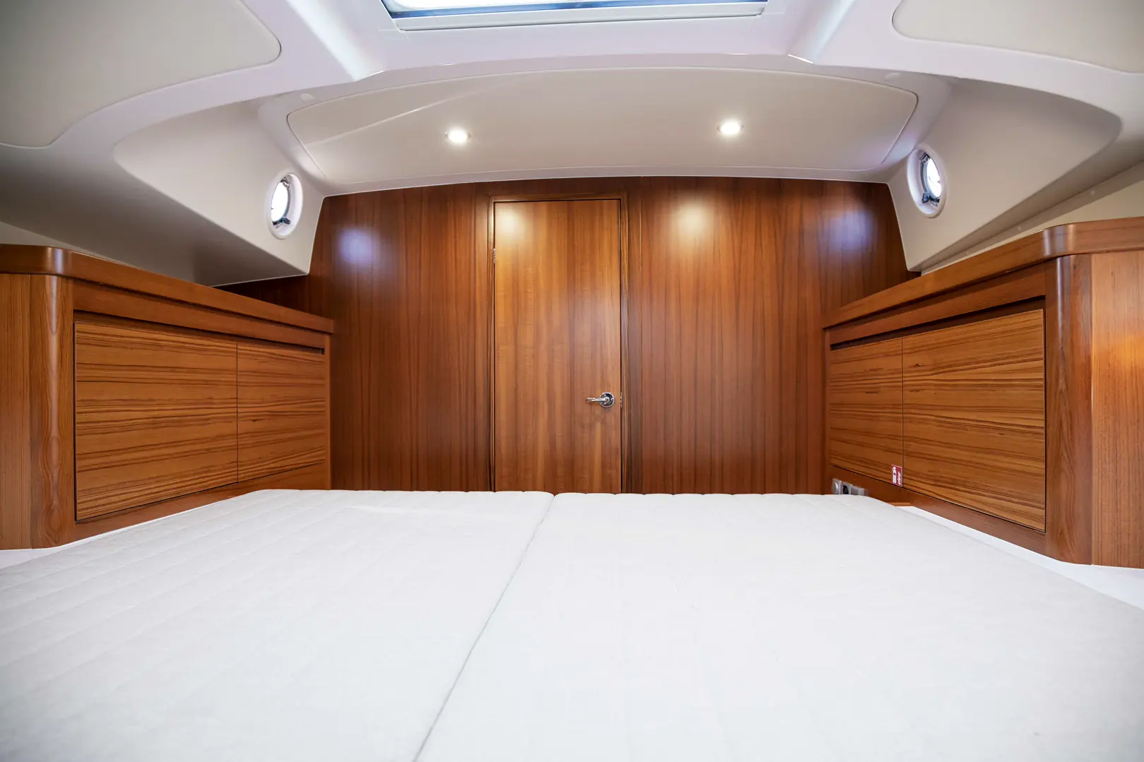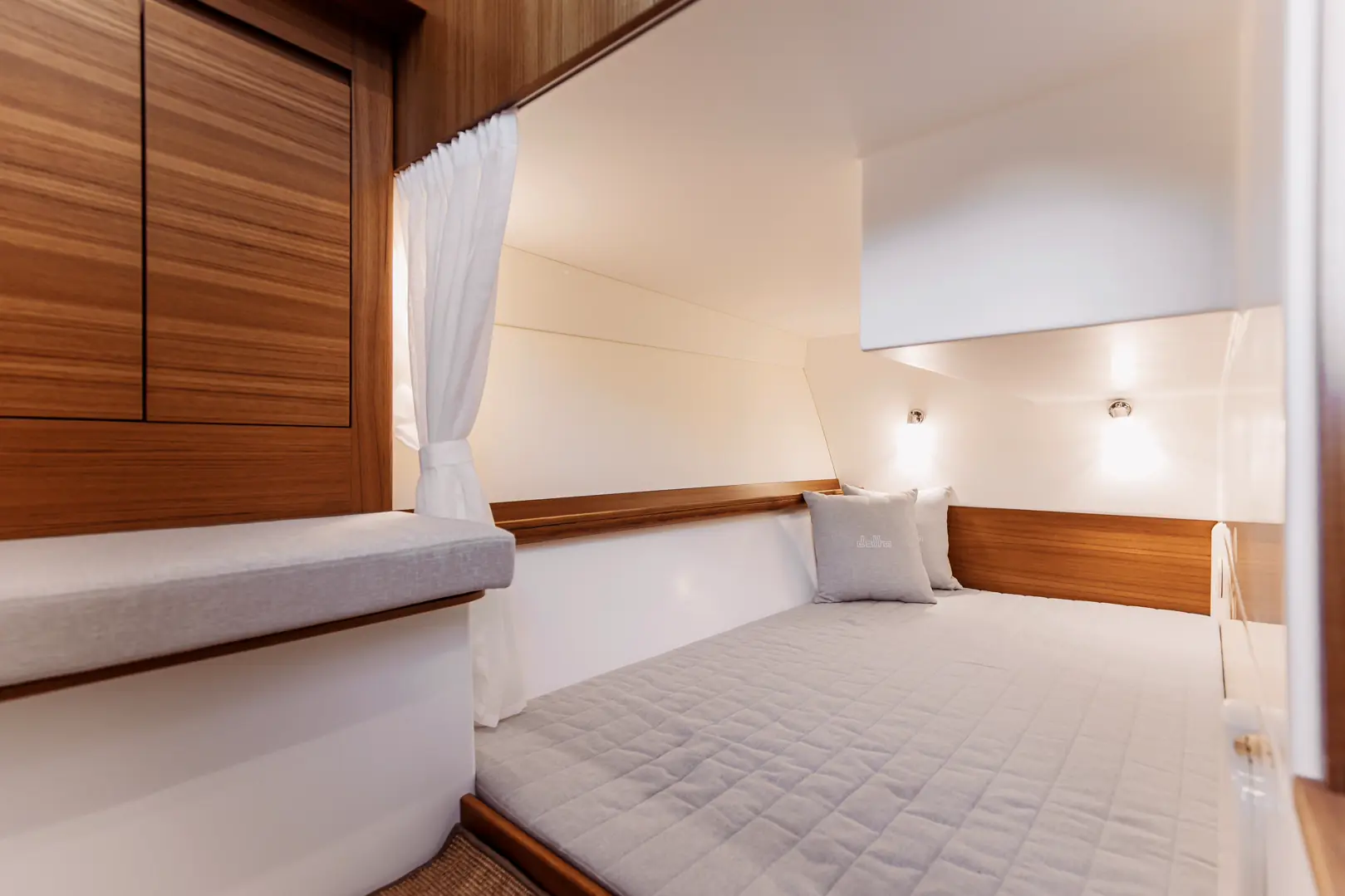 Under dekk tilbyr interiøret overnatting for fire gjester fordelt på to lugarer, i tillegg til et separat toalett på babord side og en dusjkabin på styrbord side.