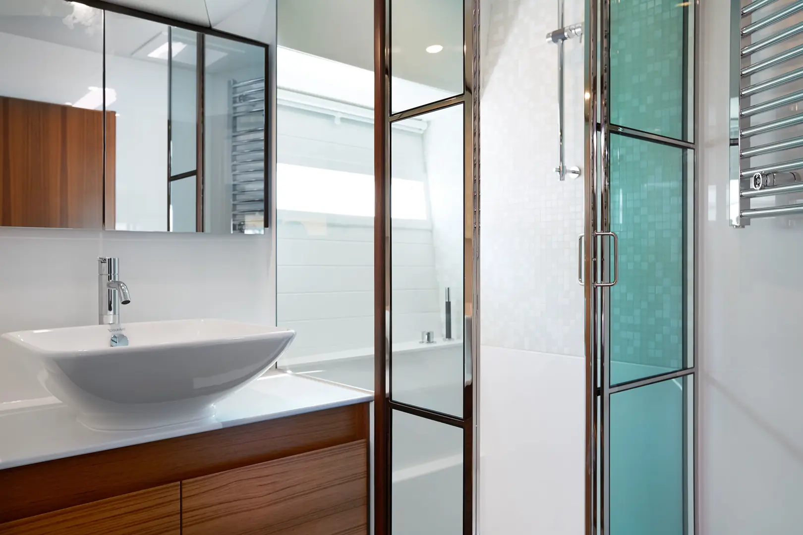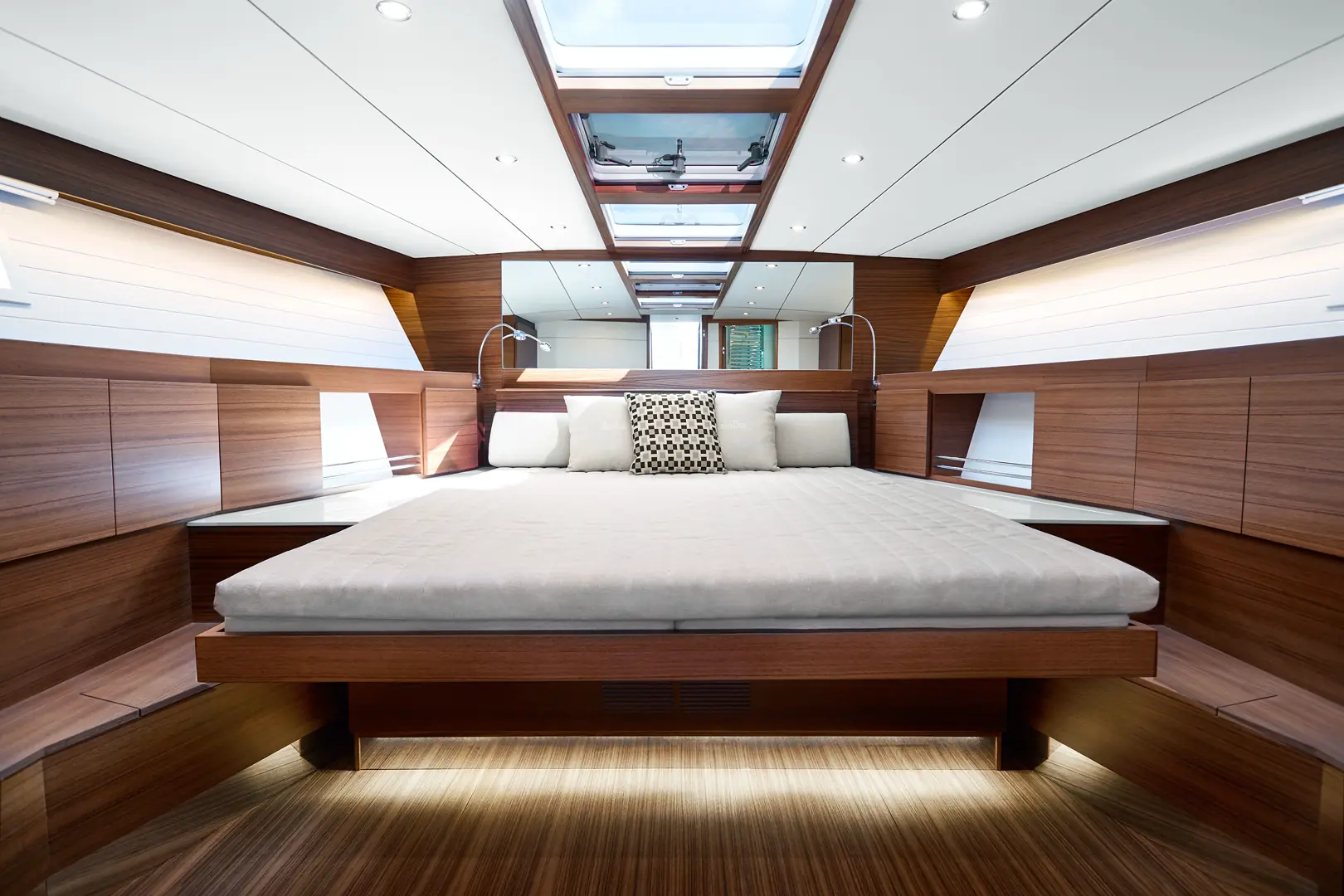 Det lyse og luftige dekkshuset nås via skyvedører i glass akter eller gjennom en pantografåpnet kapteinsdør på styrbord side. Under dekk finnes en romslig eierlugar forut med eget bad og dusj, samt to gjestelugarer midtskips med enkeltsenger eller valgfri dobbeltseng, som til sammen gir plass til seks gjester med førsteklasses komfort.