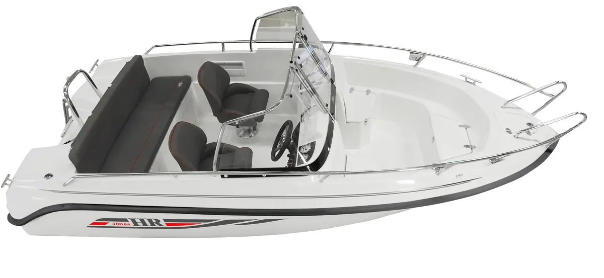 HR 480 BR er en av markedets mest velbygde og mest prisgunstig! HR betyr bekymringsfritt eierskap med komfort av beste slag. En bred og høy vindusrute/skjerm gir god beskyttelse til fem personer. Båten er lettdrevet takket være sin geniale skrogform og tar seg raskt opp til i plan.