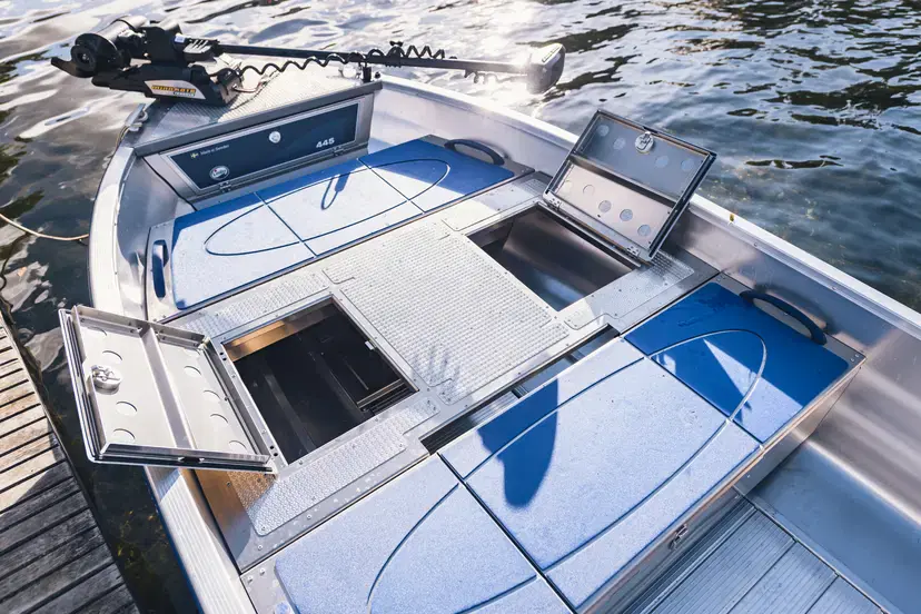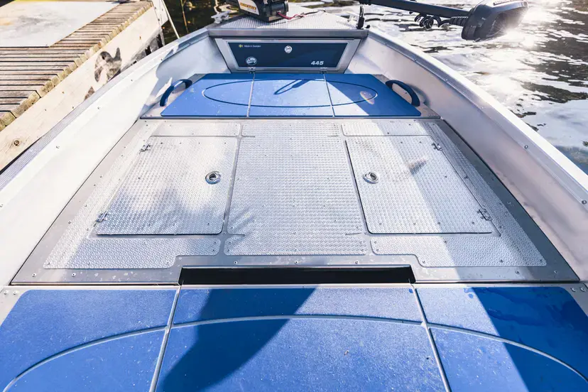 Sportsman 445 har også en konsoll, elektrisk system og griperekke med pulpit. 445 BASIC som leveres med aluminiumsårer. Et svært miljøvennlig båttvalg! Sportsman 445 er produsert i Sverige med korrosjonsbestandig aluminium av høy kvalitet, tilsvarende behandling som brukes i flykonstruksjon. Godkjent av Det Norske Veritas. ID-merking med Securmark.