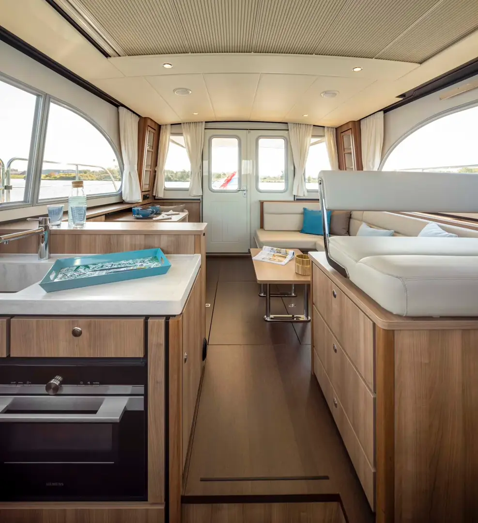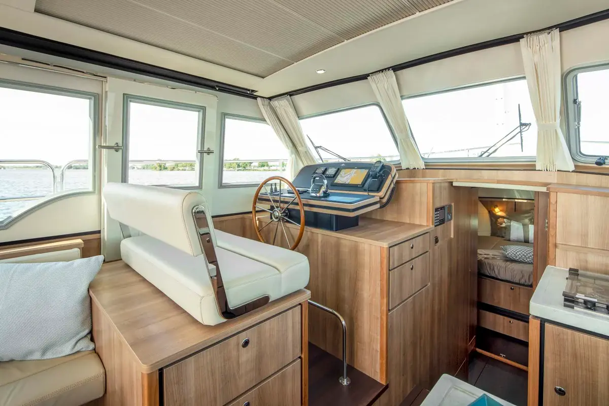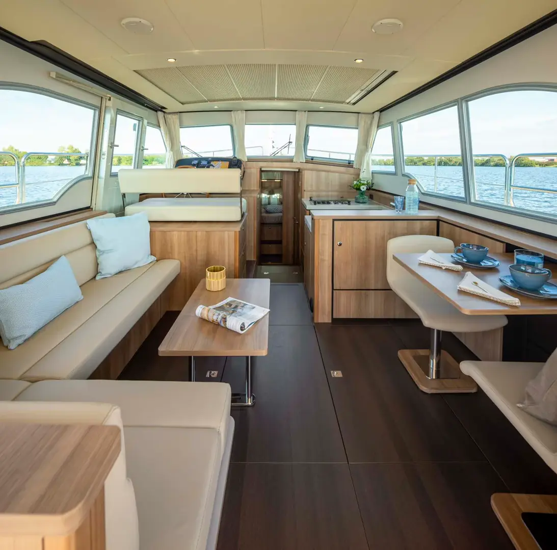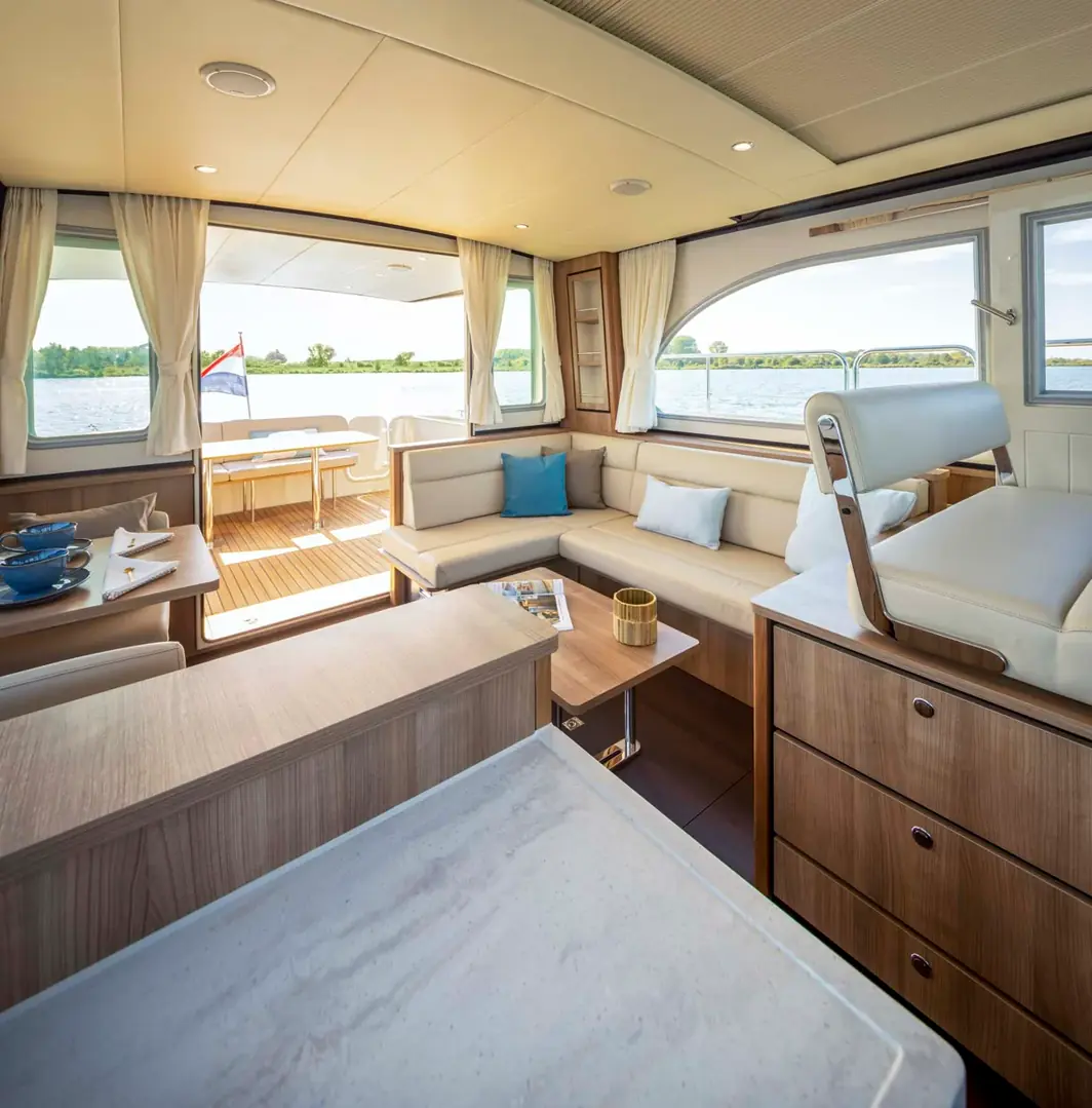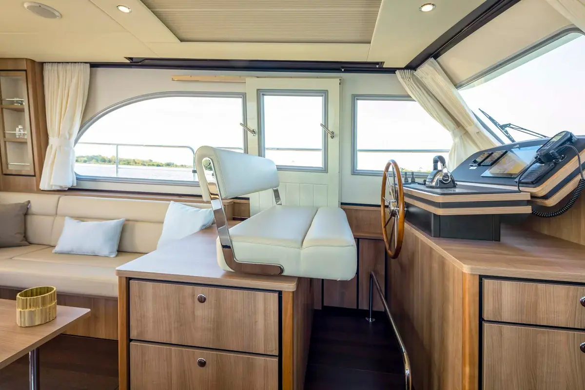 I Grand Sturdy 40.0 Sedan er salongen og cockpiten på et og samme plan, med bare en lav terskel som skille. Linssen Longtop dekker hele cockpiten, og dette betyr at du kan holde deg komfortabel og tørr når du sitter på den integrerte sofaen, med den åpning for den midtplasserte døren i akterspeilet som gir tilgang til badeplattformen.