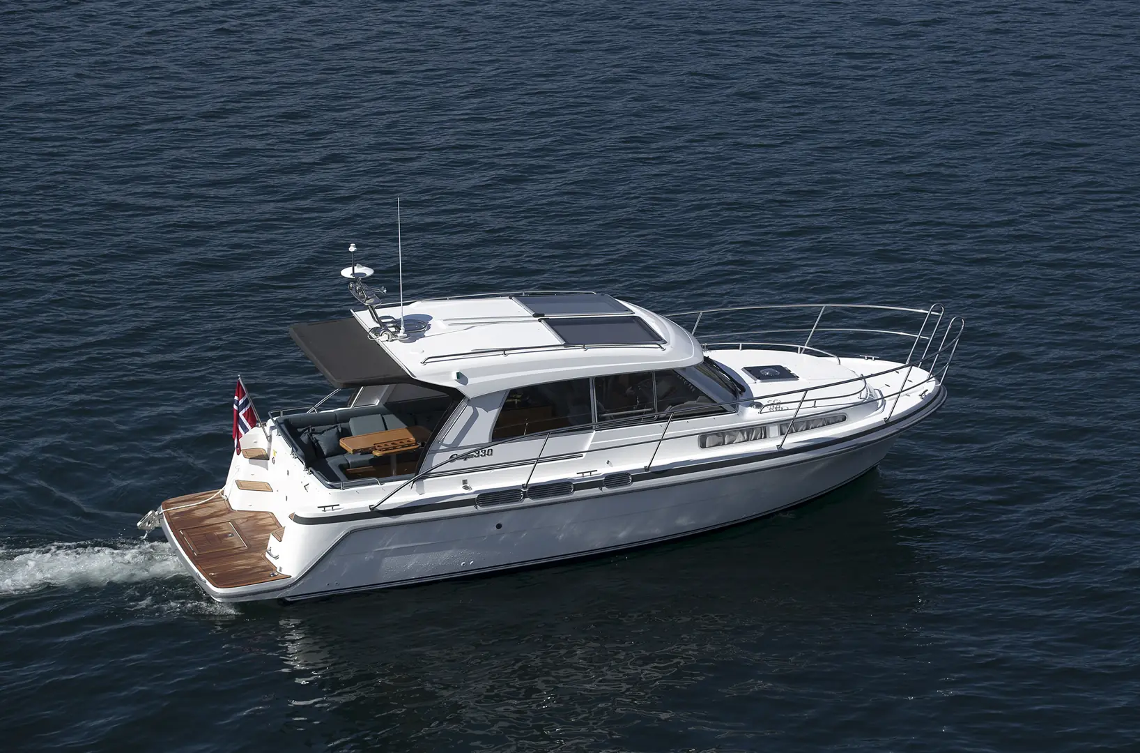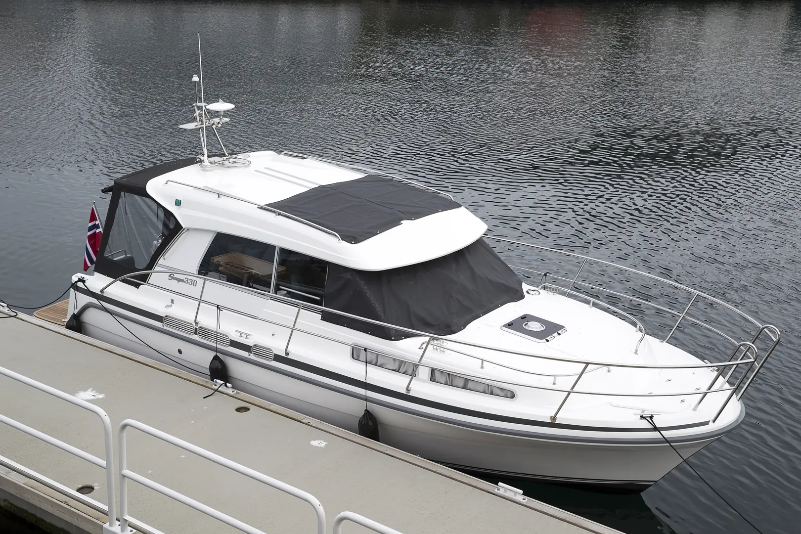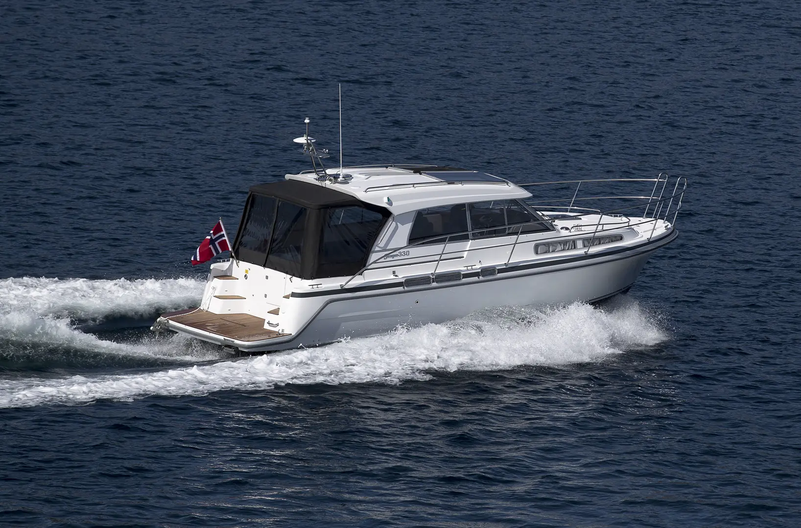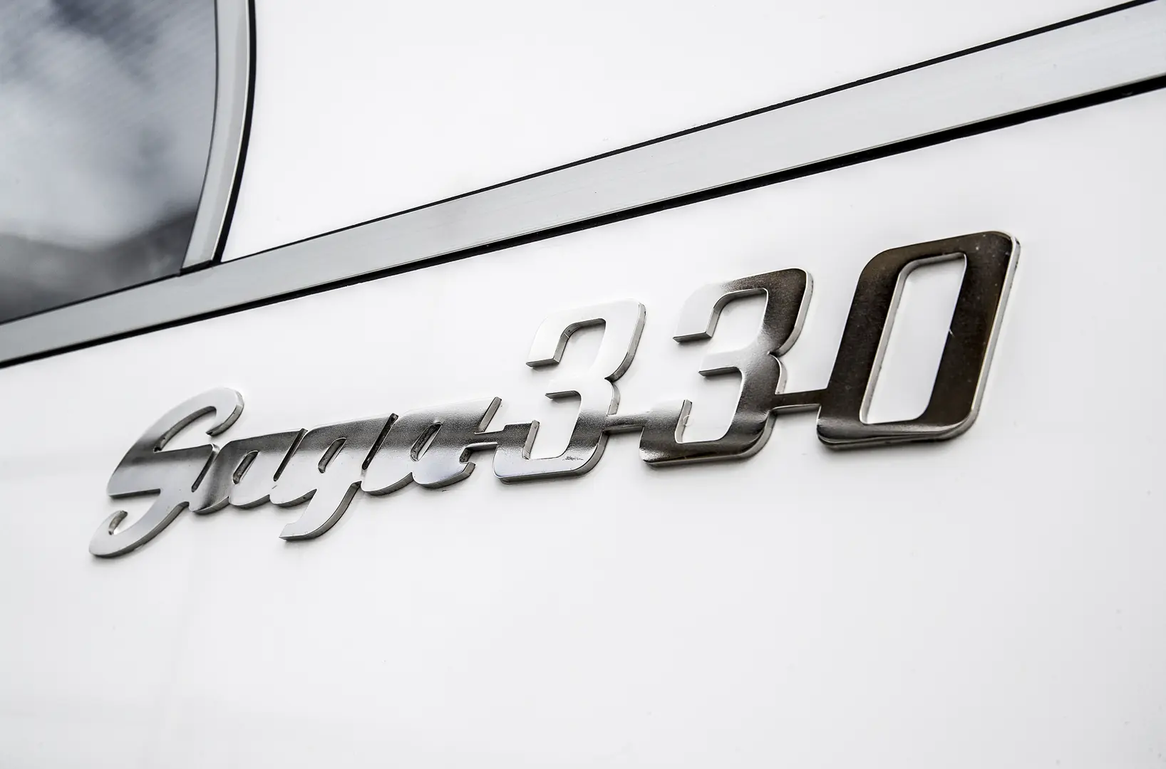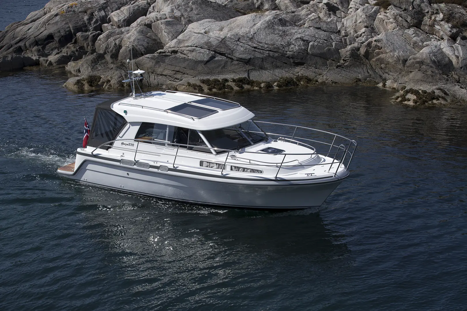 SAGA 330 er i motsetning til SAGA 325, som har skyvedør og selvlensende akterdekk, en åpen HT-modell med stor cockpit og god bokomfort. HT-versjonen med store skyveluker gir en mer beskyttet båt, mens SunTop versjonen med en gedigen luke med elektrisk softtop er perfekt for de gode sommerdagene. Båten er halvplanende med beskyttet propell og innenbords motor. Båtturen kan således nytes også i rolig gange.
