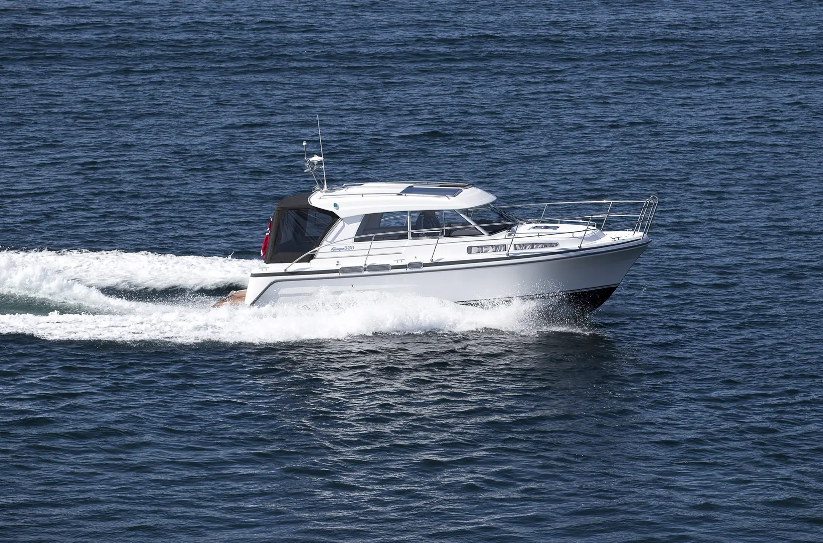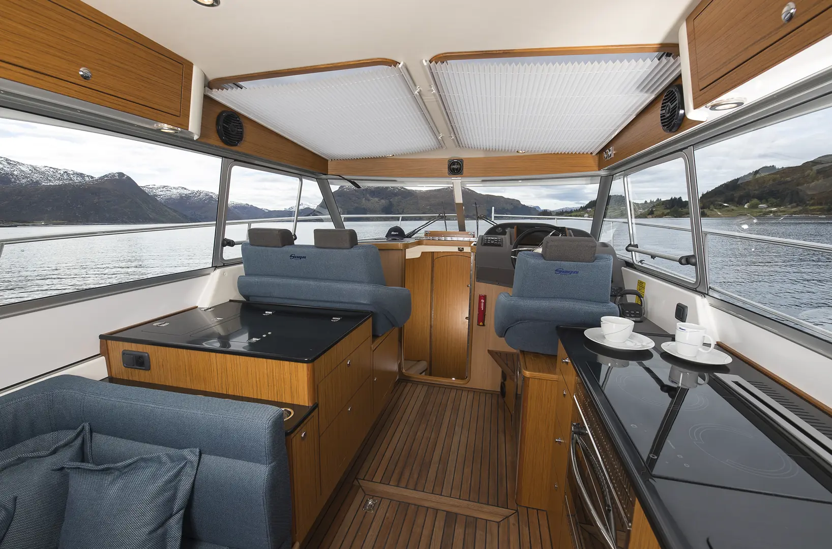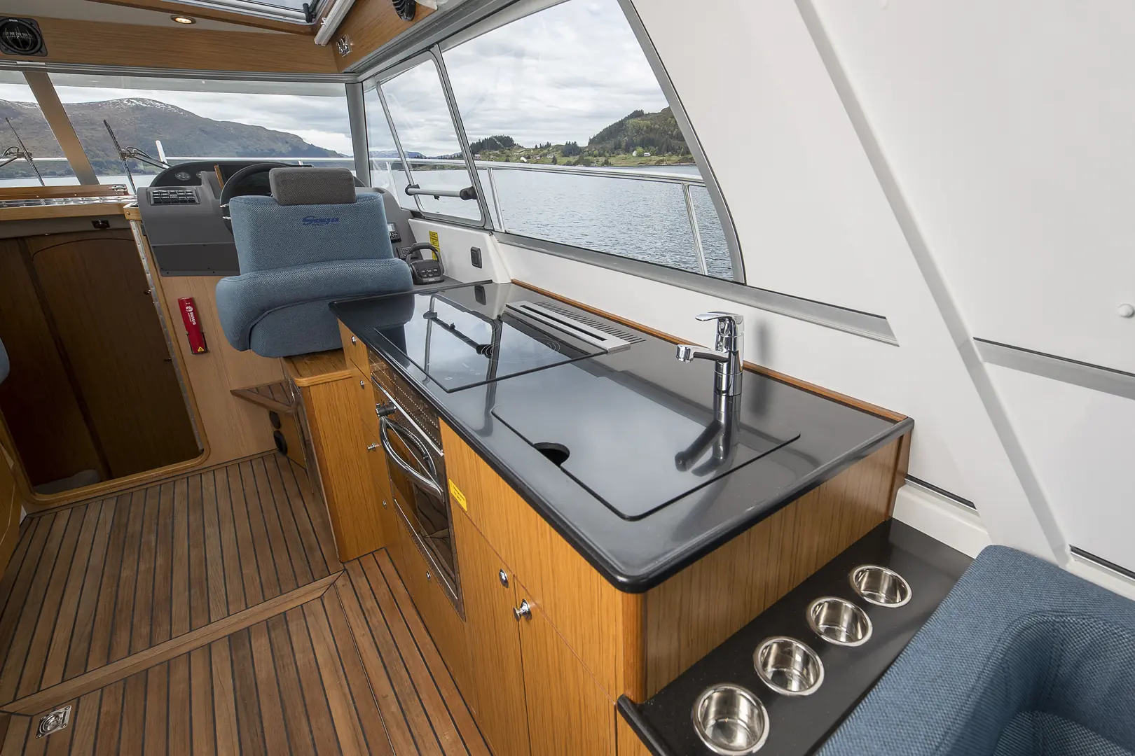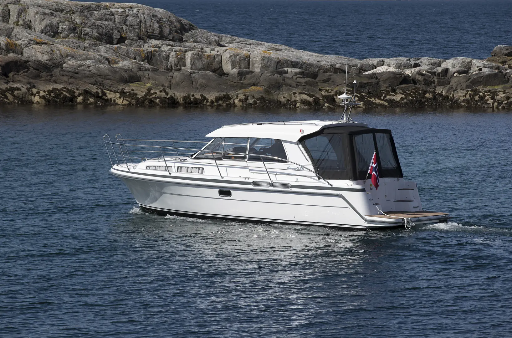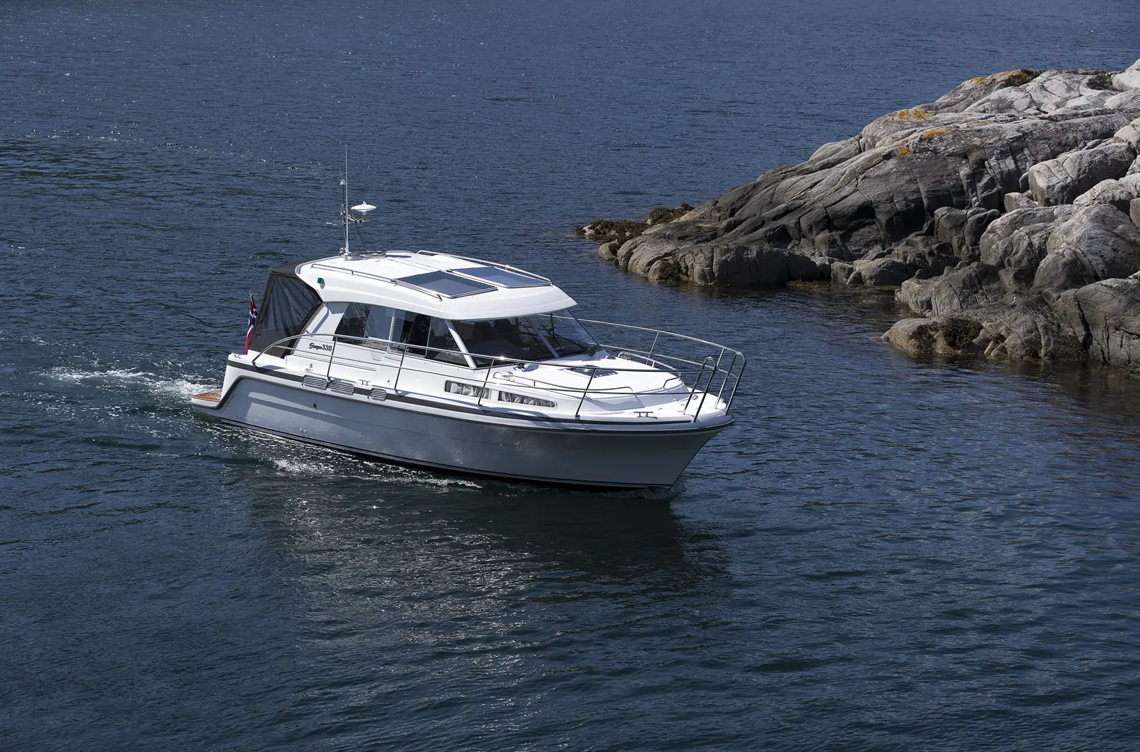 SAGA 330 er i motsetning til SAGA 325, som har skyvedør og selvlensende akterdekk, en åpen HT-modell med stor cockpit og god bokomfort. HT-versjonen med store skyveluker gir en mer beskyttet båt, mens SunTop versjonen med en gedigen luke med elektrisk softtop er perfekt for de gode sommerdagene. Båten er halvplanende med beskyttet propell og innenbords motor. Båtturen kan således nytes også i rolig gange.