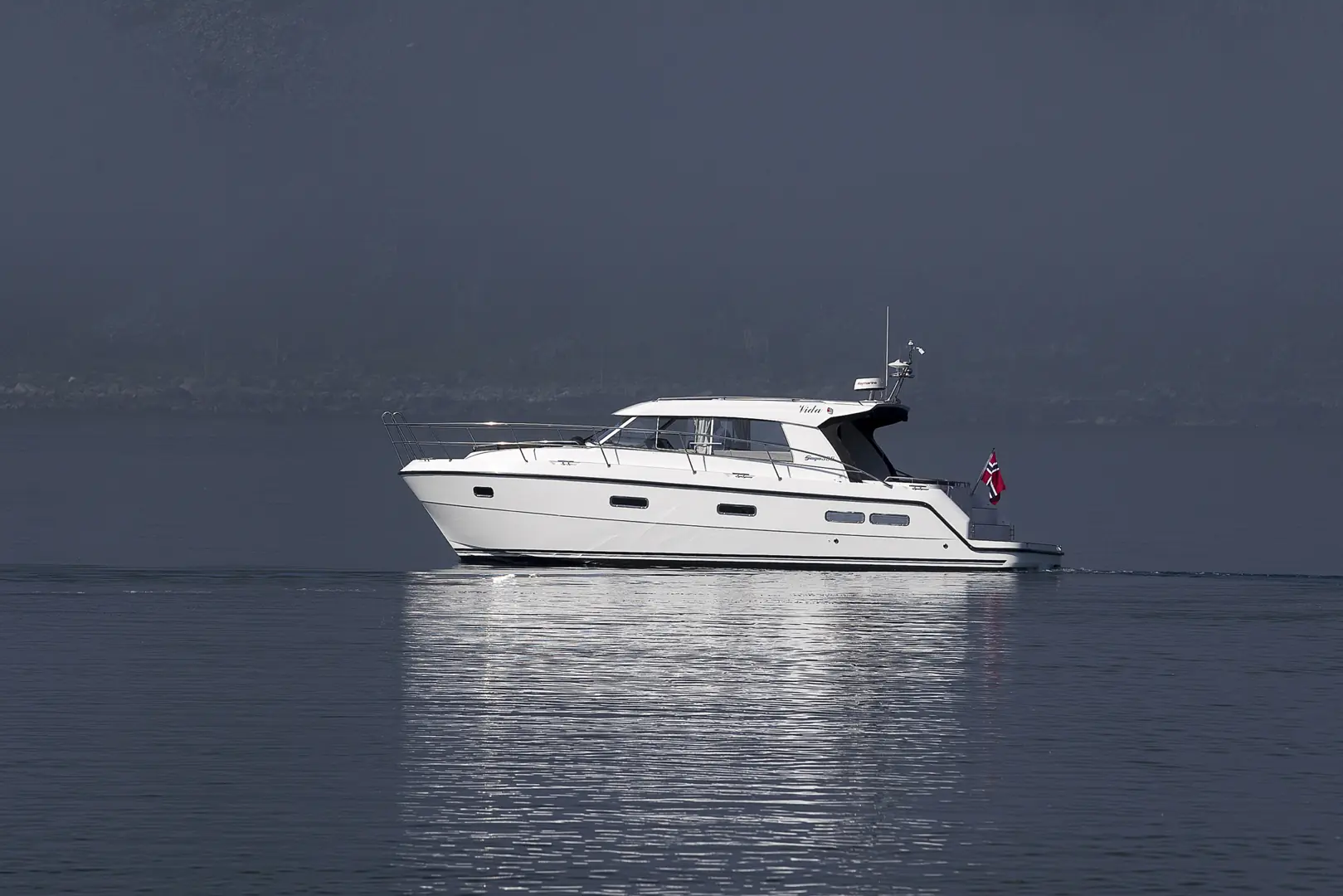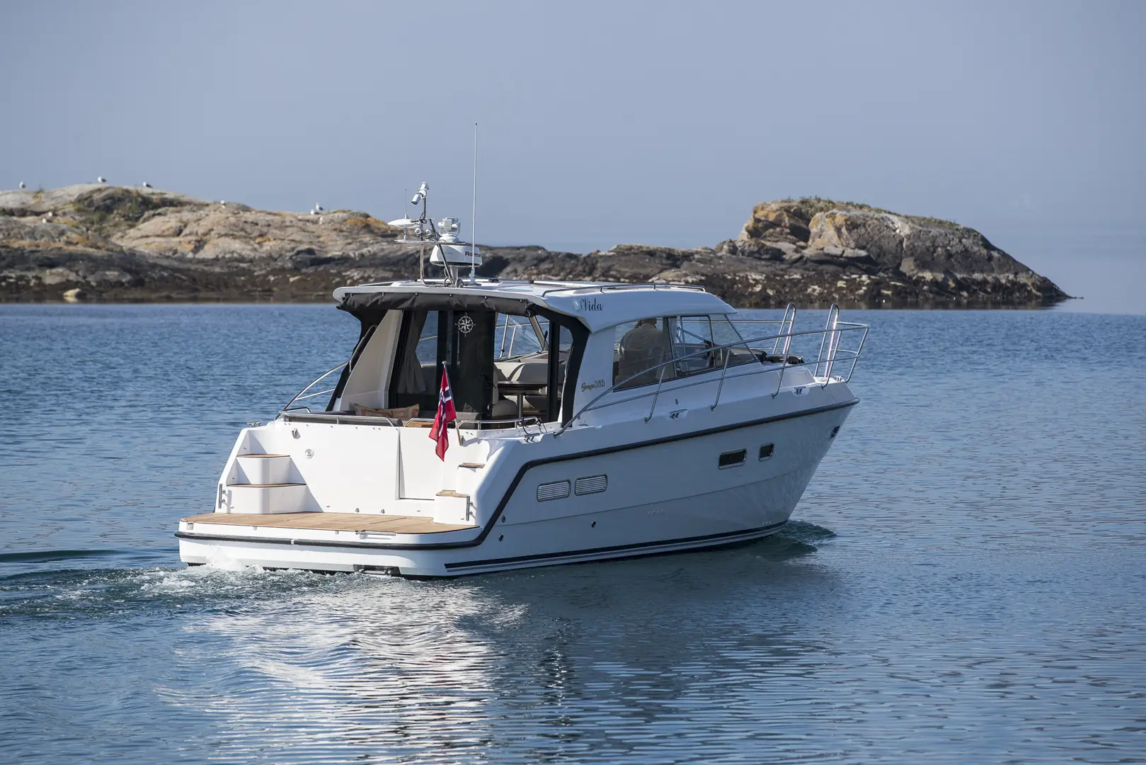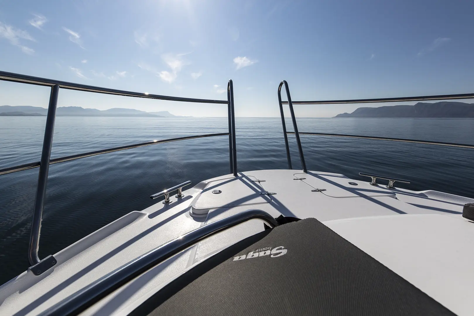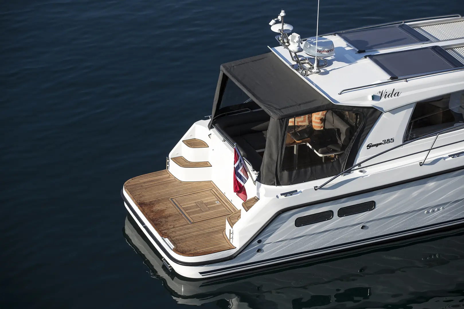 SAGA 385 byr på uovertruffen bokomfort, svært gode sjøegenskaper, god drivstofføkonomi og langt høyere marsjfart enn våre tidligere modeller. Legg spesielt merke til det svært romslige akterdekket, den over 3 meter lange midtkabinen og det store badet med dusjkabinett. Den store badeplattformen med integrert aktervinsj byr på egen oppholdssone og god plass til jolle på eget stativ. Båten er godt isolert og egner seg også til bruk i kaldere perioder av året. Drømmebåten for den aktive båtbruker!