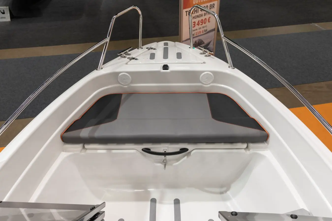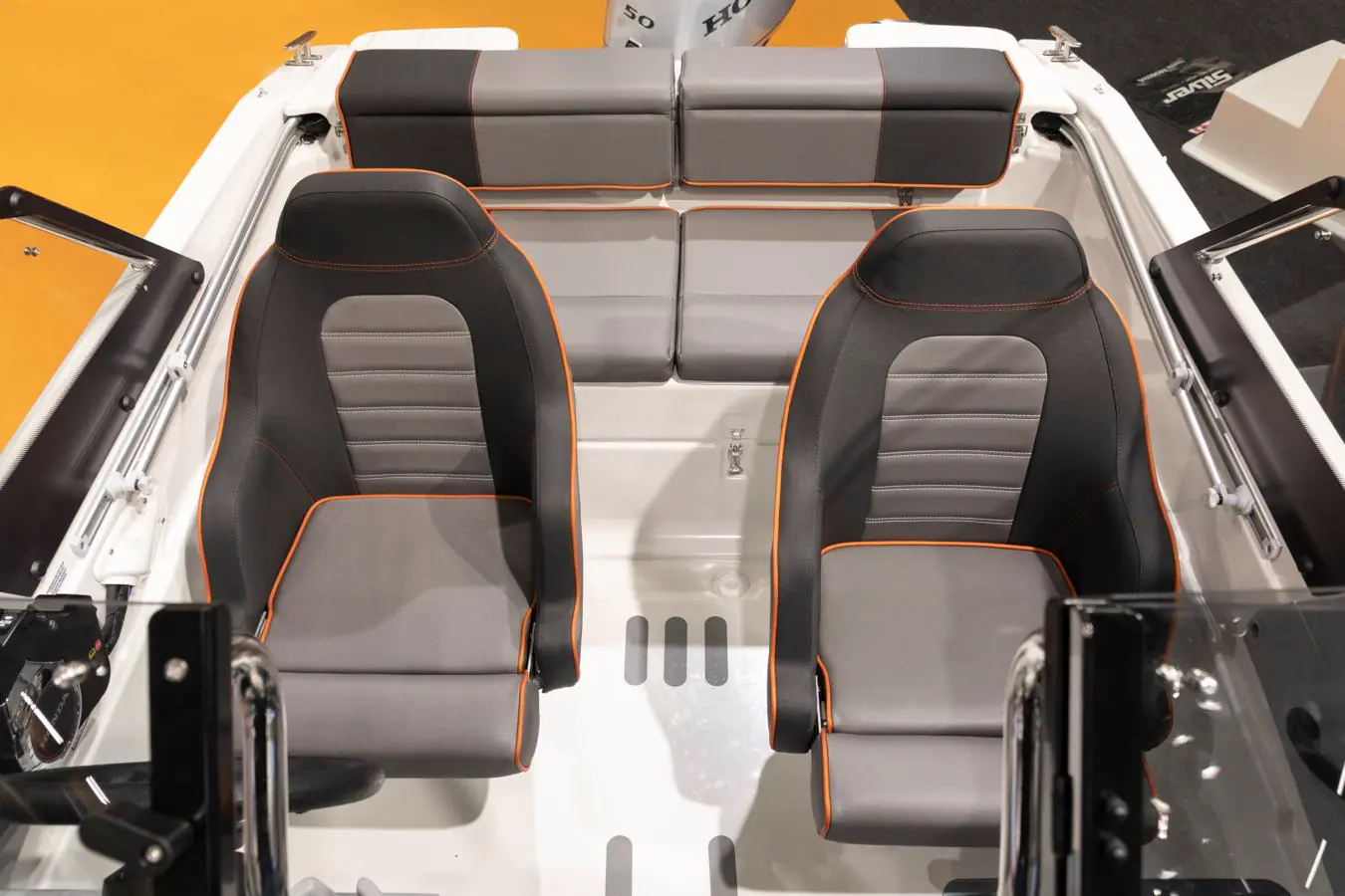 Bakdekket er utstyrt med to separate, polstrede seter samt en bred akterbenk som utgjør en sittegruppe for totalt fem personer. De beskyttende konsollene har ekstra god oppbevaringsplass samt en egen plass til kartplotter. I konsollene finner du også strømuttak samt to låsbare hanskerom.