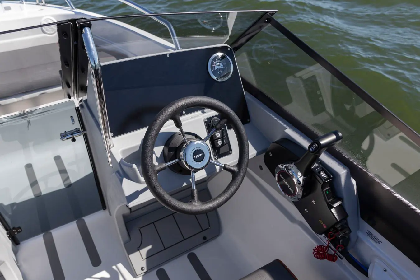 Denne nyere, sporty og nesten fem meter lange bowrideren har dobbel konsoll, og sammen med døren mellom konsollene beskytter dette bakdekket mot vind og sjø.