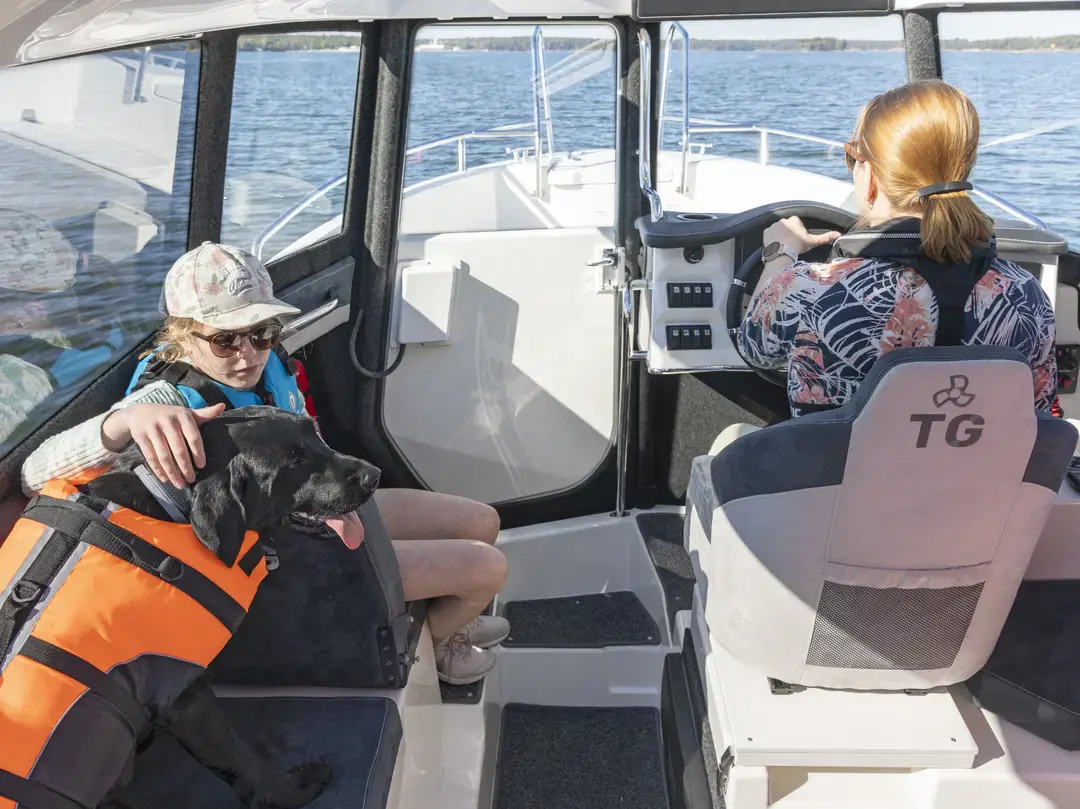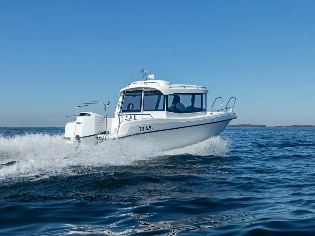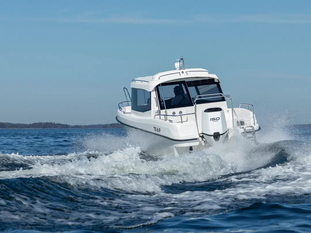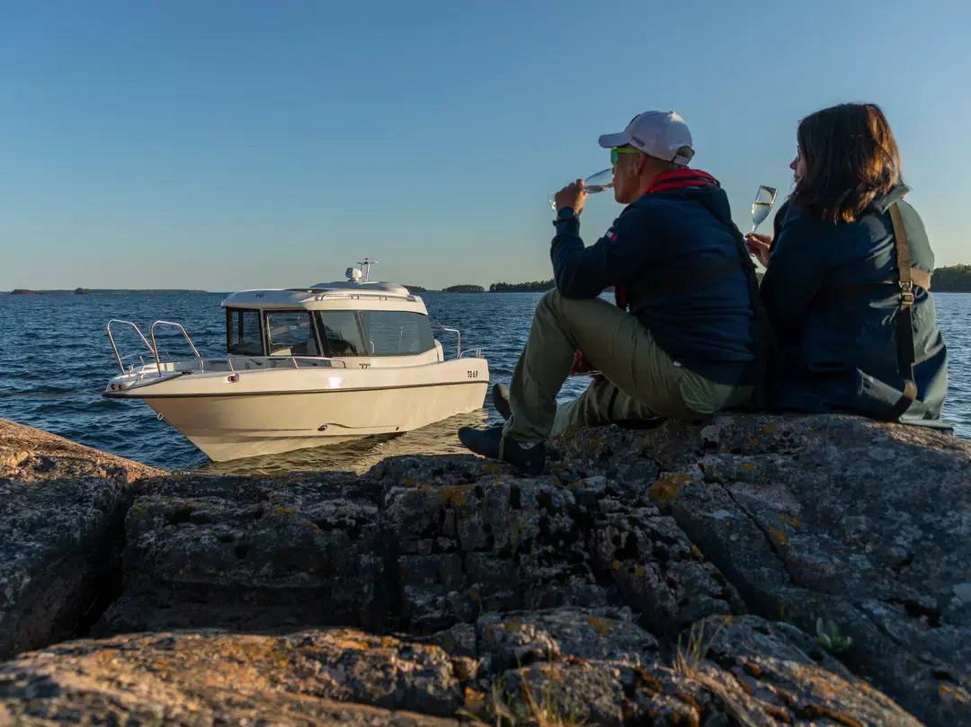 Sosial, bestselgende kabinbåt fra 2019 - 2021 i Finland! Den er komfortabel, romslig og har praktiske detaljer for dagsturbruk. Stort soltak gir mye lys i kabinen og kan åpnes på varme dager.