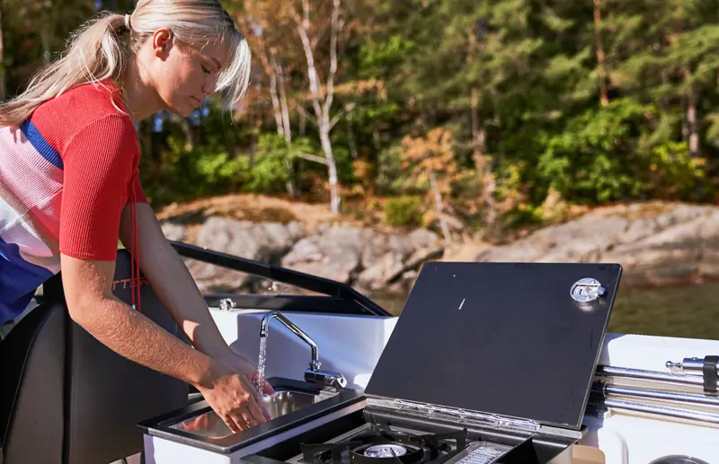 T65 er en flott båt hvis du vil være nær vannet. Opptil sju personer kan ta en plass i baugområdet eller i cockpiten. Ikke en eneste tomme av dekket er ubrukt, likevel fant designerne en måte å integrere en kompakt og praktisk kabin.