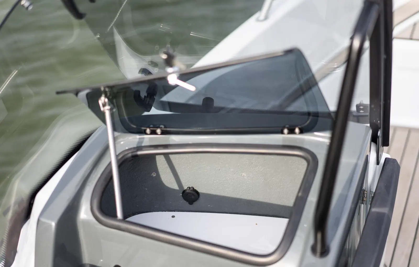 Den åpne plassen forut er praktisk og trygg: de store trinnflatene gjør det enkelt å gå ombord og bevege seg rundt i båten. Den solide vindskjermen gir god beskyttelse mot sjøsprøyt og vind. Valg av anti skli Softdeck på dørken bidrar til økt sikkerhet og utseende. Det samme gjør det stilige og robuste rekkverket rundt vindskjermen.