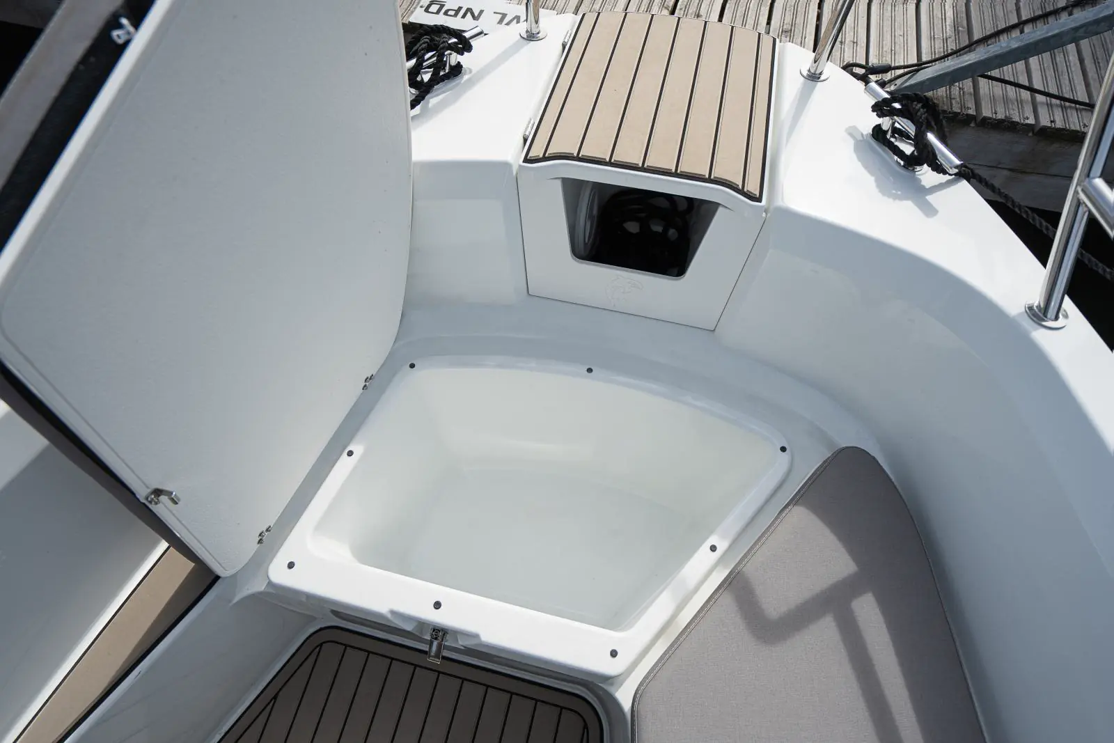 Båten har god bredde hvilket gjør det lett å gå ombord fra baugen, fra sidene samt de brede badeplattformene i hekken. Takket være sidekonsollen er tilgangen fra baug til hekk trygg og ryddig. Hele dørken og alle dekksflater er dekket av et stilig sklisikkert Softdeck materiale som standard.