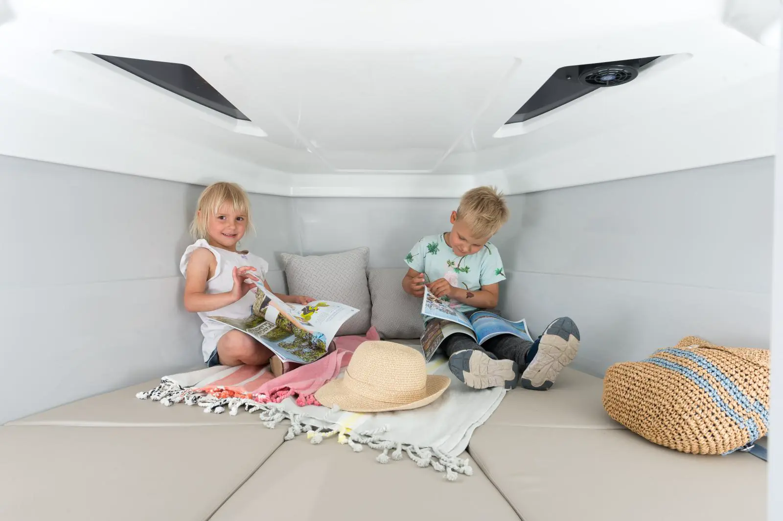 For kabinen på den Yamarin 63 DC har køyer for to og plass for bagasjen. Skrogvinduene i baugen, dekkslukene og de lyse interiørfargene gir båten et lyst og romslig inntrykk. Etter en hyggelig dag på sjøen er det enkelt å dekke til båten med havnekalesjen som holder båten ren og alltid klar for nye utflukter.