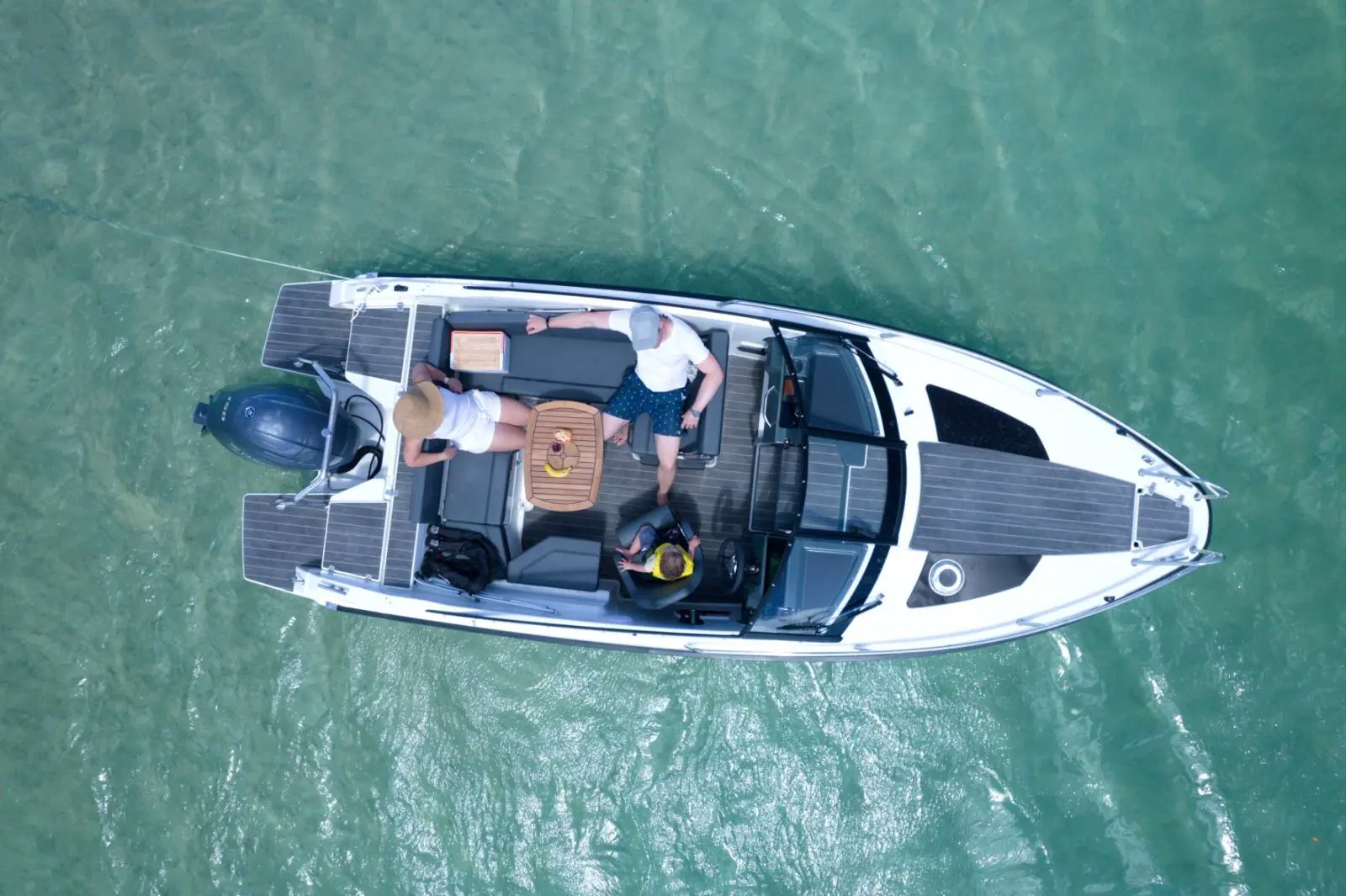 Bordet, solsengen og kjøleskapet, som er tilgjengelig som tilvalg, gir det lille ekstra for å heve opplevelsen på sjøen enda noen hakk. De romslige badeplattformene gir ikke bare enkel ombordstigning fra stranden, de inviterer også til et bad.