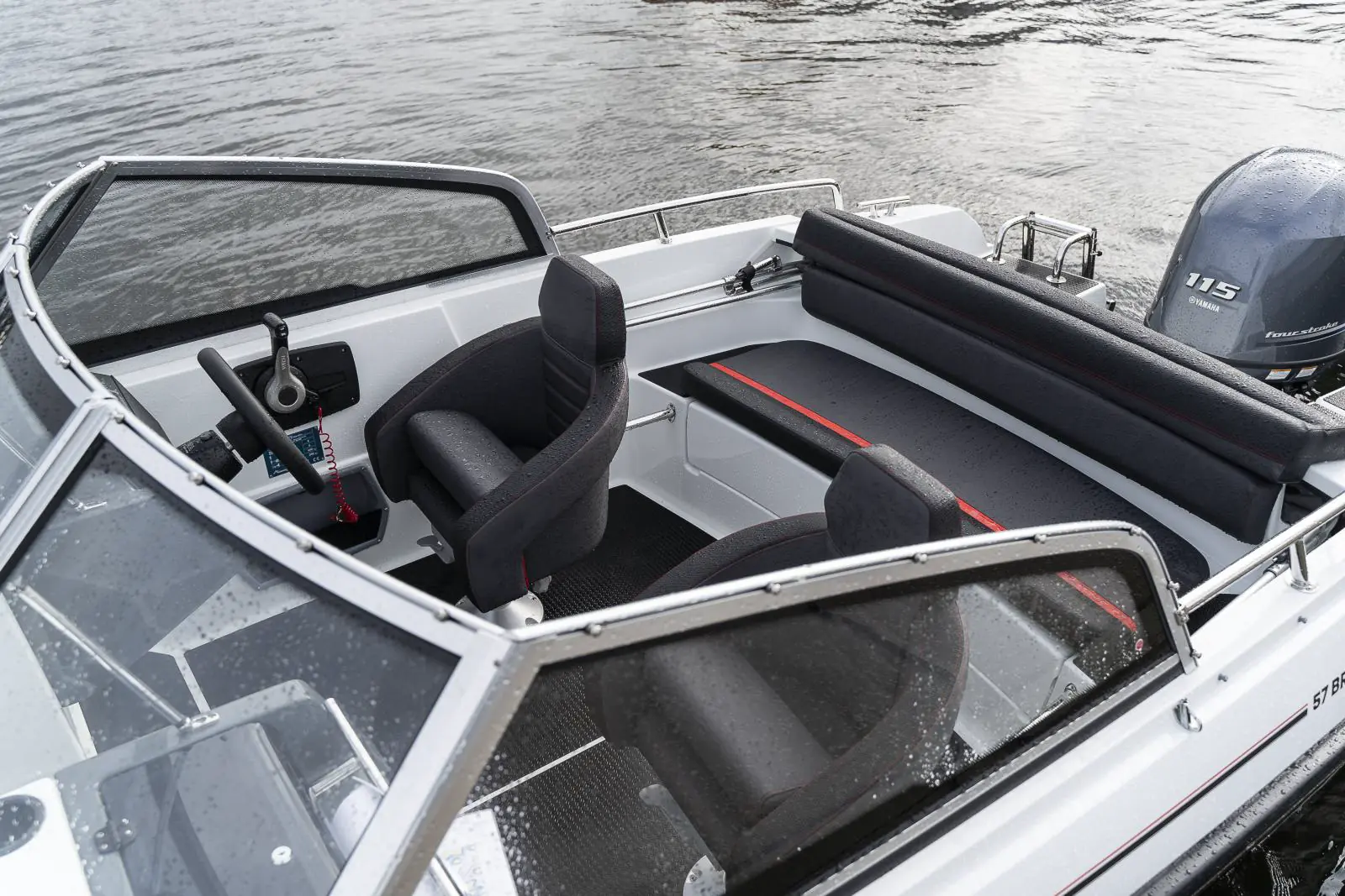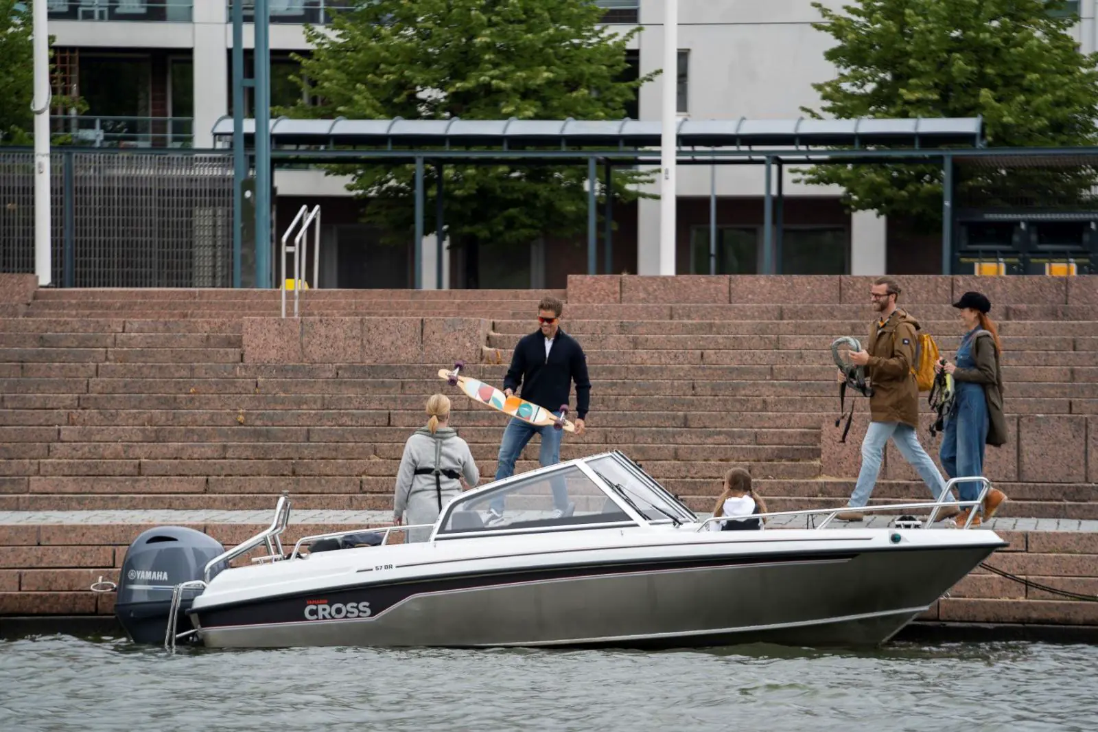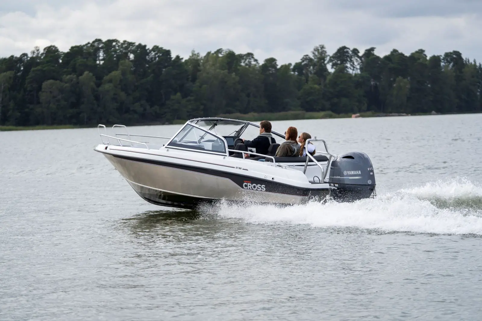 Ingenting er bedre enn når de gode opplevelsene kommer av seg selv. Det er tanken bak Cross 57 BR. En båt du fort kan komme deg på vannet med når været eller humøret innbyr til en båttur. Aluminiumsskrog og glassfiberinnredning kombinerer soliditet med et elegant interiør, mens designet gir god sitteplass bak en beskyttende vindskjerm. Her kan sex personer dra på båttur med god komfort. Dessuten har Cross 57 BR smarte sitteplasser i baugen og bred passasje gjennom hele båten. Det er ubekymret båtbruk satt i system.