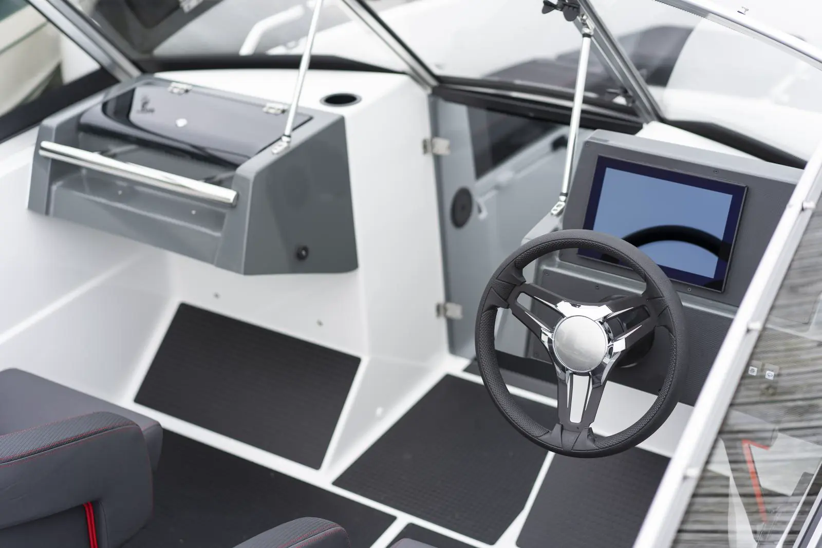 På førerplassen finner du infotainmentsystemet Cross Q. Her finner du en komplett kartplotterløsning med GPS-navigasjon og digitale sjøkart. En stor og lyssterk 10-tommers betjeningsskjerm gjør det enkelt å finne frem. Men Cross Q byr på langt mer enn trygg navigasjon. Her er alle motorinstrumentene samlet, og utstyrer du båten med musikkanlegg kan du høre på spillelistene via Bluetooth.