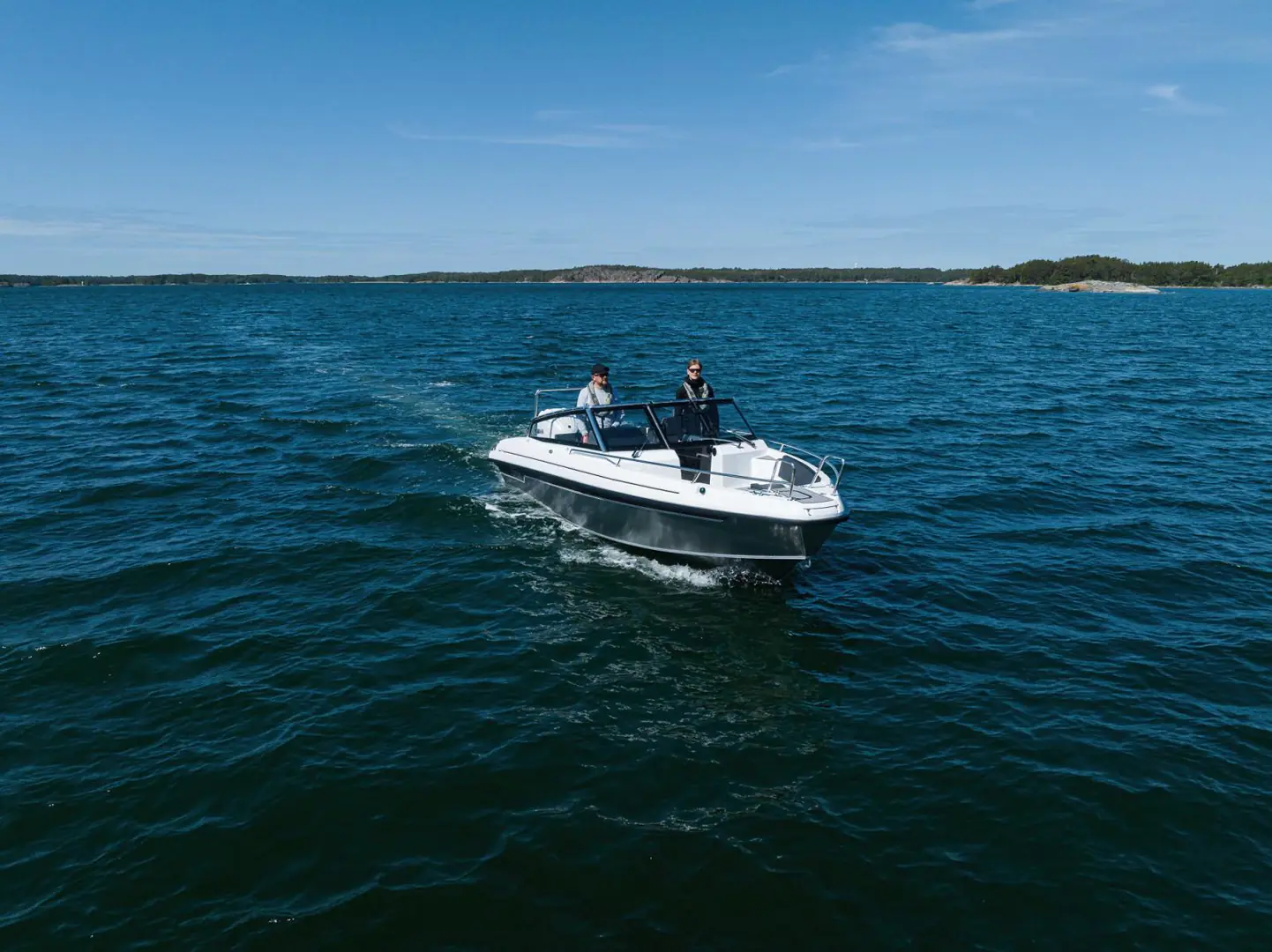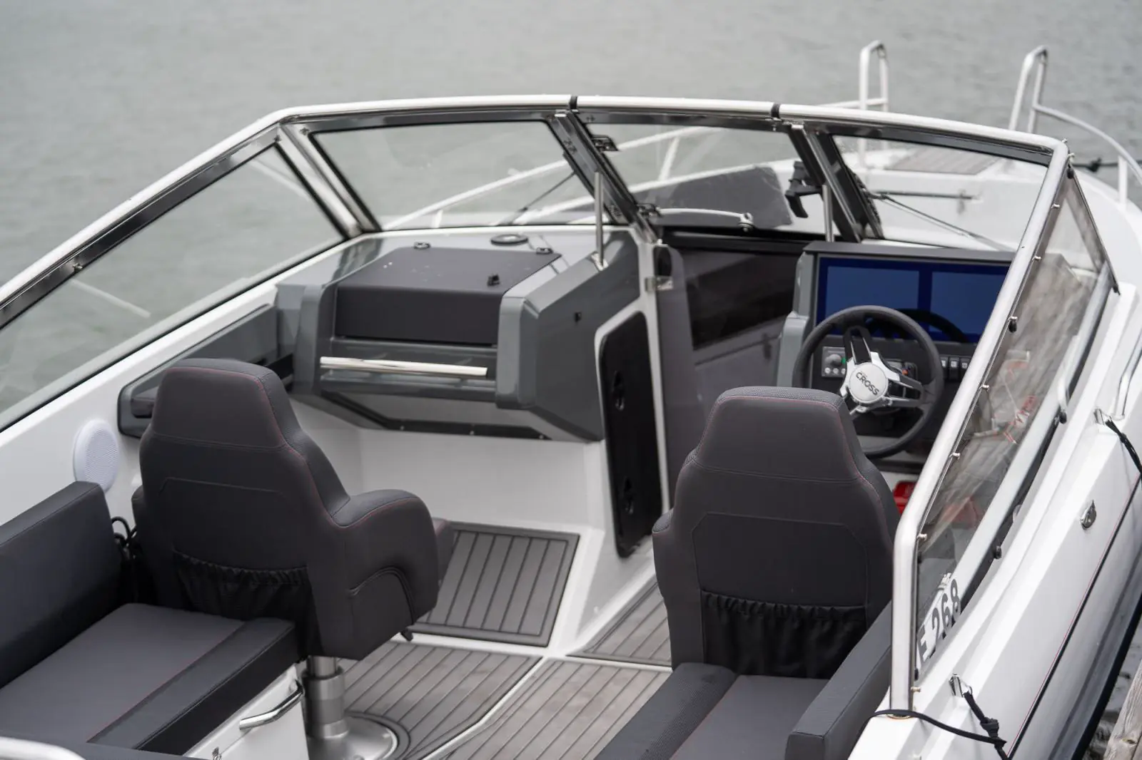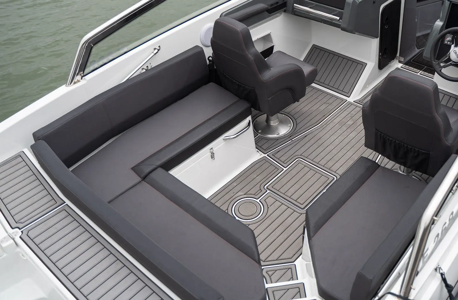 Vindskjermen er trukket rundt mye av sitteområdet og sørger for god beskyttelse – både for de to i stolene foran, eller gjengen som nyter tilværelsen i den smarte sitteløsningen akter. Den fungerer som en rommelig U-sofa, men har en praktisk utsparing med trinn i bakkant. Resultatet er enkel inn- og utstigning, både til badeplattformene og til og fra brygga. Velger du båten med vannskibøyle, gir den et sikkert grep når du beveger deg i området akter.