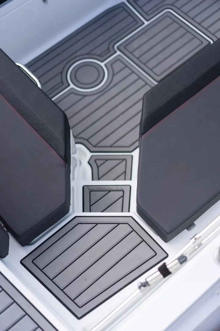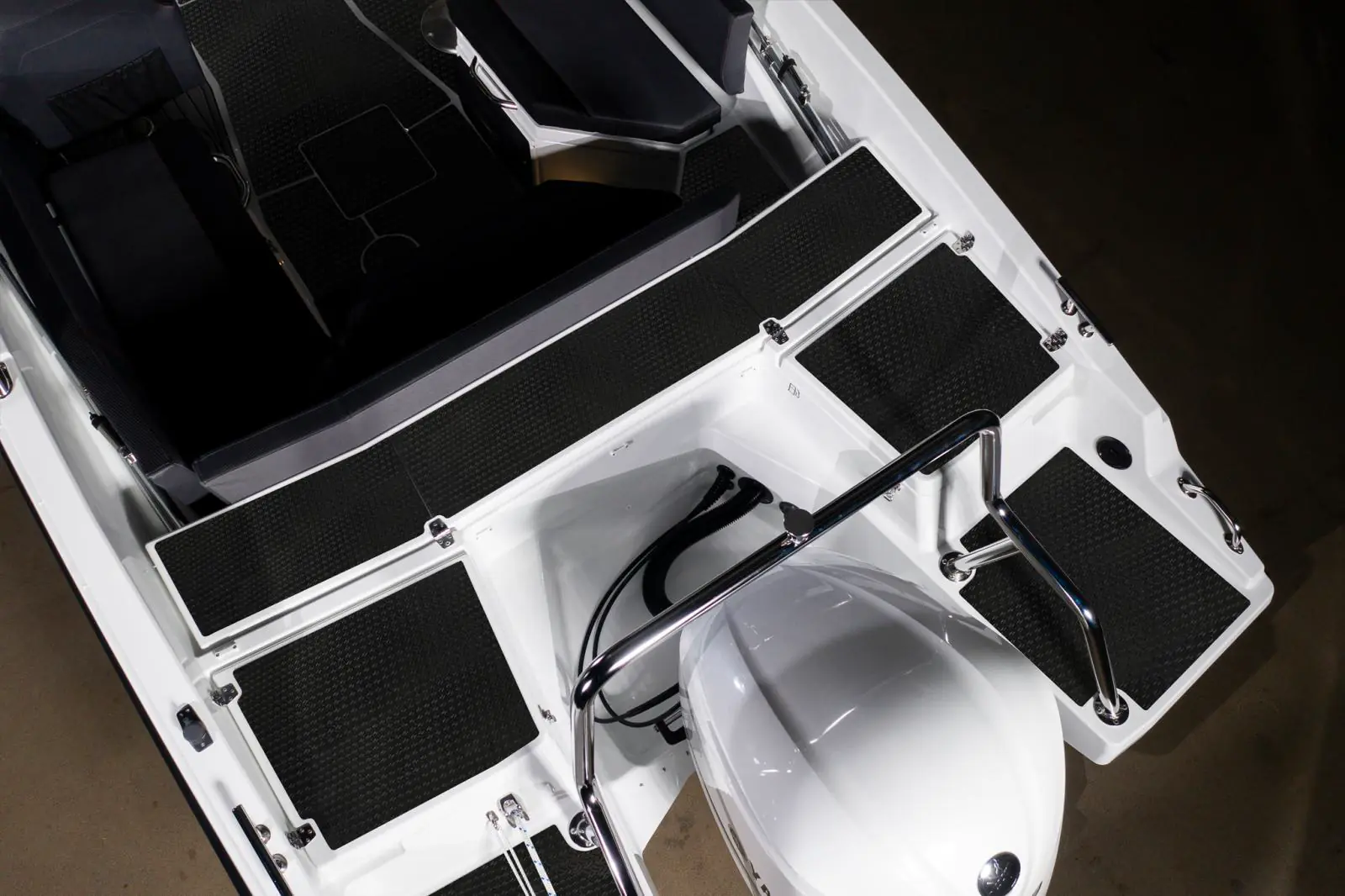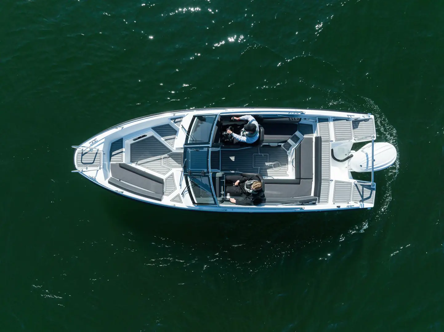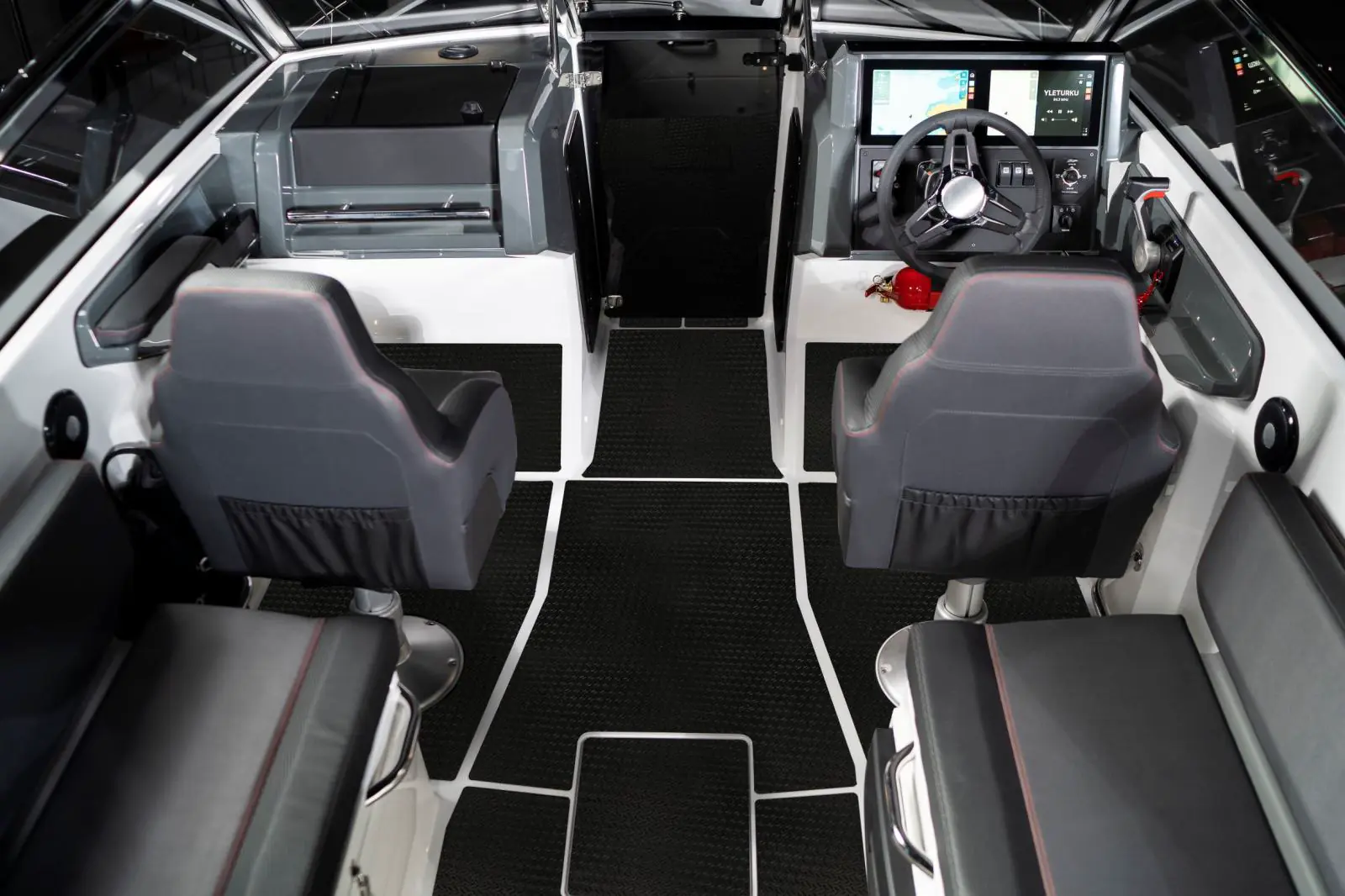 Vindskjermen er trukket rundt mye av sitteområdet og sørger for god beskyttelse – både for de to i stolene foran, eller gjengen som nyter tilværelsen i den smarte sitteløsningen akter. Den fungerer som en rommelig U-sofa, men har en praktisk utsparing med trinn i bakkant. Resultatet er enkel inn- og utstigning, både til badeplattformene og til og fra brygga. Velger du båten med vannskibøyle, gir den et sikkert grep når du beveger deg i området akter.
