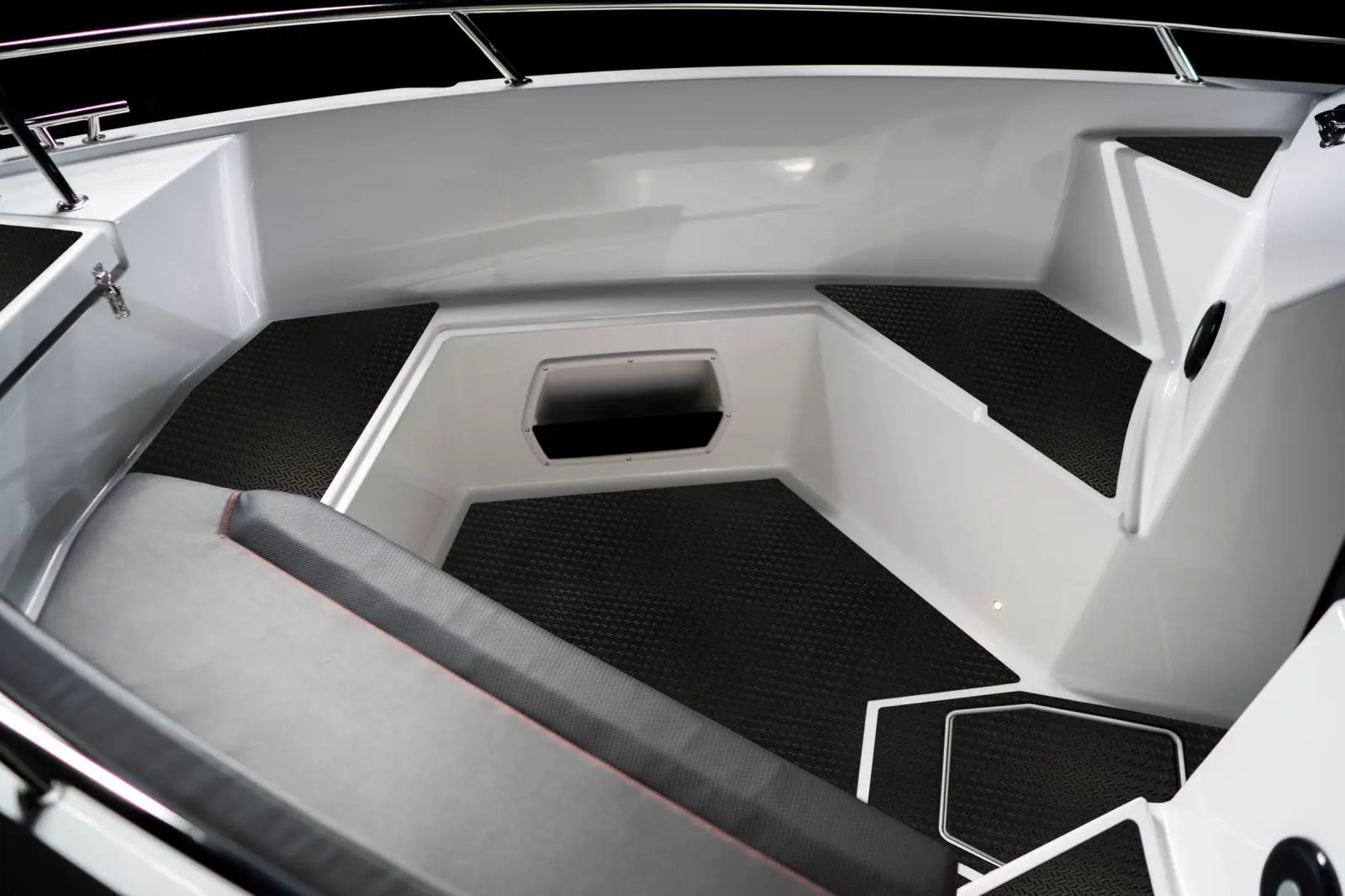 Tilsvarende enkelt et det å entre båten forut. Her finner du en solid bøyle og trinn i baugen, samt store trinn på begge sider foran vindskjermen. Sjelden har det vært flere muligheter til å komme trygt om bord. Dekksplassen i baugområdet rommer også en fin sittebenk. Vil du sette prikken over i-en, kan Cross 75 BR leveres med Softdeck dørkbelegg. Det er sklisikkert, mykt å gå på og ser lekkert ut i tillegg.
